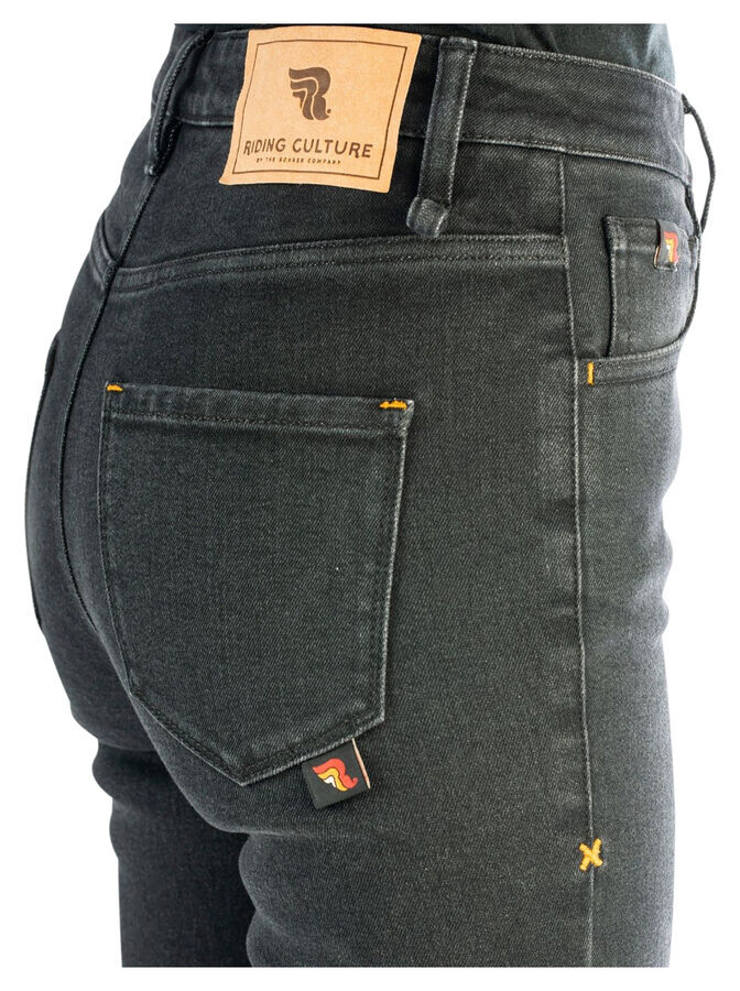 The Riding Culture *High Waist* — это облегающие женские джинсы с пятью карманами и высоким поясом. . И вам это понравится. Особенно благодаря их сертификации (AA) в качестве мотоциклетных брюк. Потому что теперь вы действительно можете носить свои новые любимые джинсы целый день. . Будь то поездка на мотоцикле или встреча с друзьями. Вы всегда правильно одеты и наслаждаетесь защитой джинсового материала с высокой устойчивостью к истиранию. сверхплоские и мягкие протекторы для бедер и колен ImpacTec, а также специальные Комфортная посадка по фигуре благодаря эластичному материалу. *Высокая талия* обработана энзимами, создавая модный черный вид. Он хорошо защитит вас при аварии . И выглядит действительно стильно.