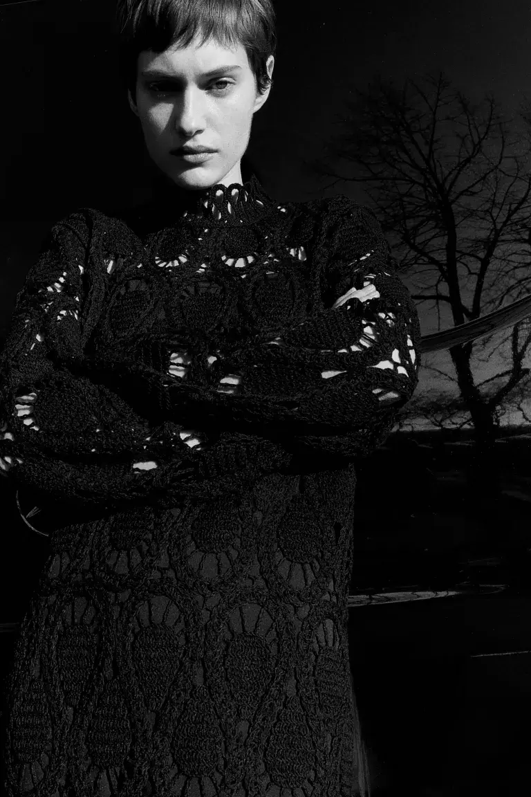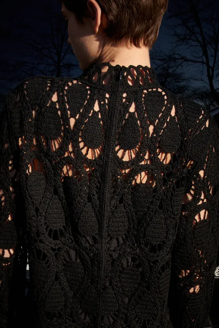 Длинное платье, связанное крючком, с длинной бахромой по подолу. Небольшой воротник-стойка, потайная молния сзади и длинные рукава. Короткое платье-комбинация из трикотажа с регулируемыми бретельками-спагетти.