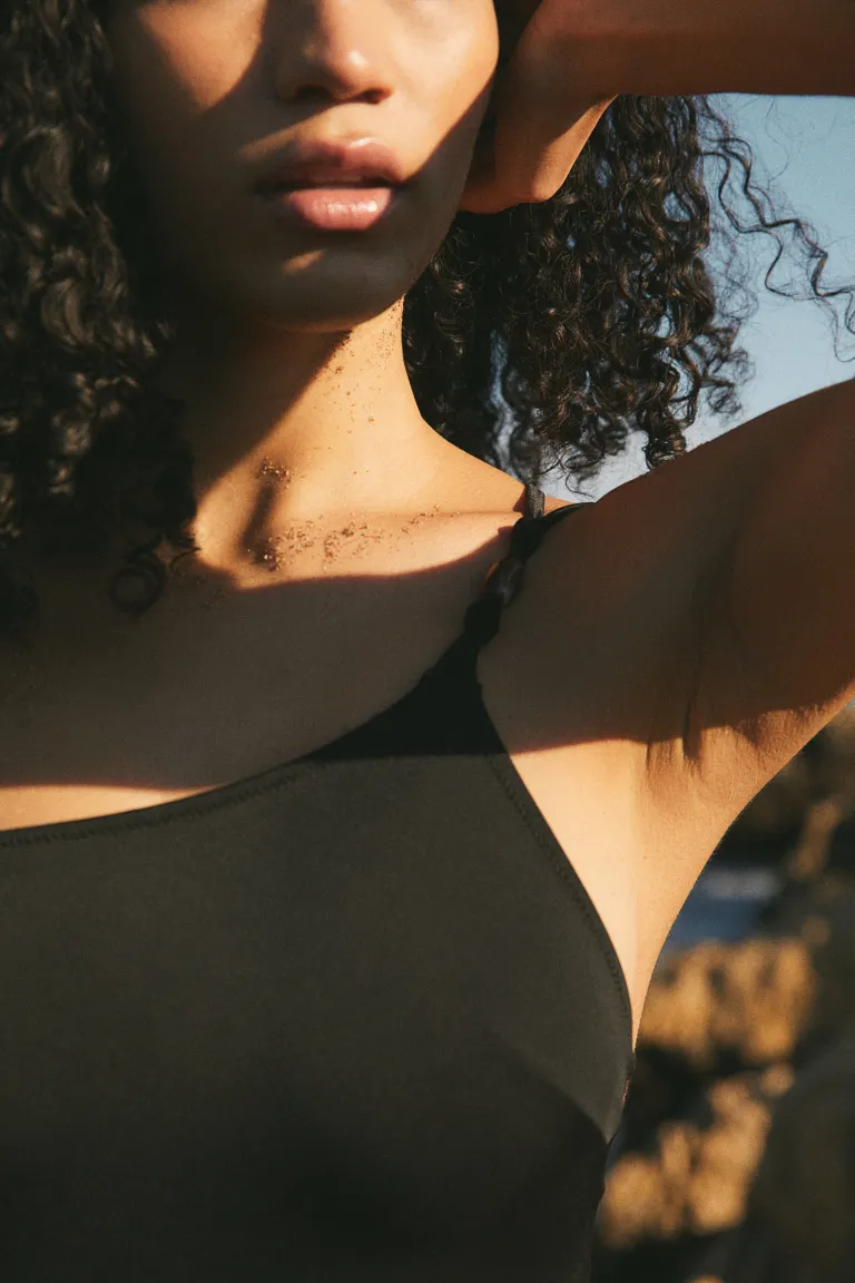 Асимметричный купальник на одно плечо на подкладке, с овальным вырезом сзади и узкими двойными бретелями, которые соединяются спереди. Чашки со съемными вставками, которые придают груди форму и обеспечивают хорошую поддержку. Высокий крой по ноге и средняя прикрытая спина.