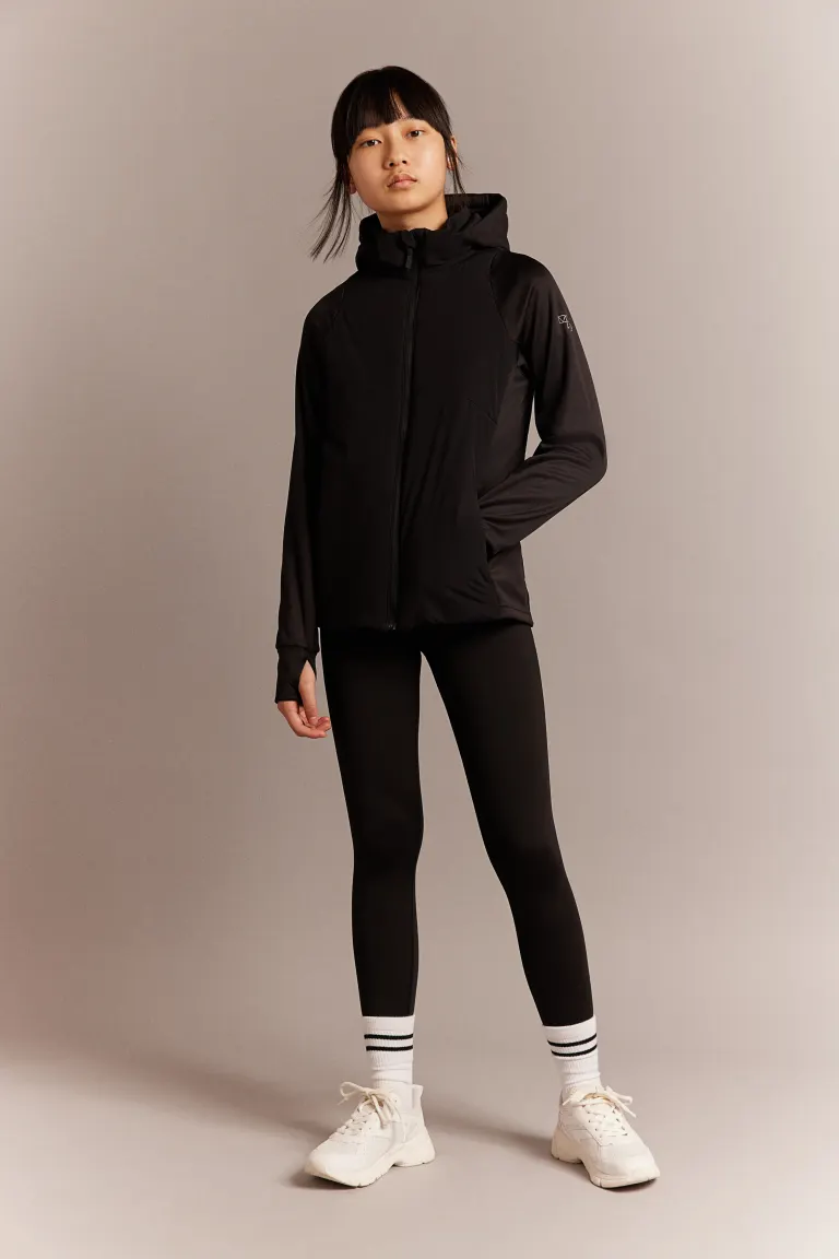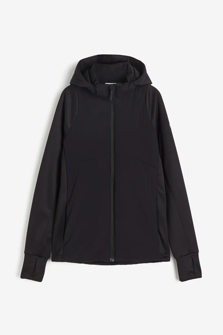Гибридная куртка из трикотажа с секциями из ветрозащитного функционального материала. Съемный двухслойный капюшон, воротник-стойка и передняя молния с защитой подбородка. Мягкие области спереди и сзади сохраняют тепло. Манжеты с отверстиями для больших пальцев предотвращают задирание и сохраняют запястья и руки в тепле. Передние карманы на молнии для безопасного хранения ценных вещей. Частично на подкладке. Длина: Стандартная длина Длина рукава: Длинный рукав Посадка: Классический крой Воротник: Воротник-стойка Функции: Ветрозащитный