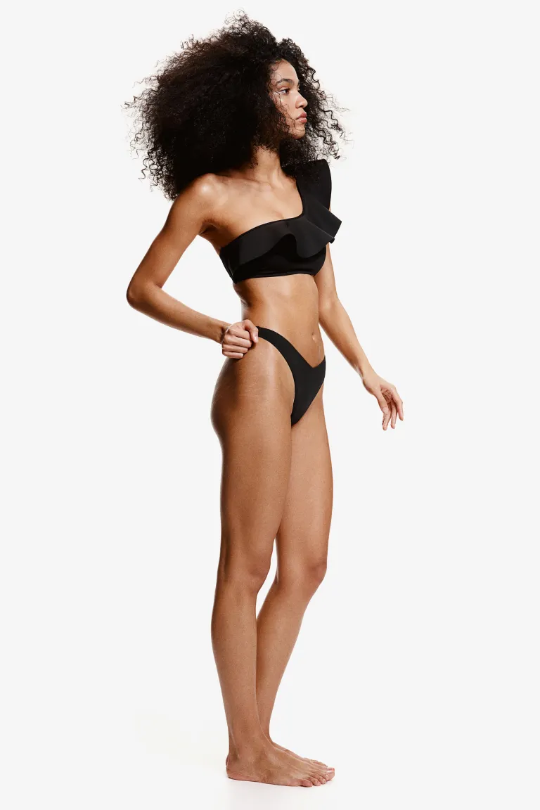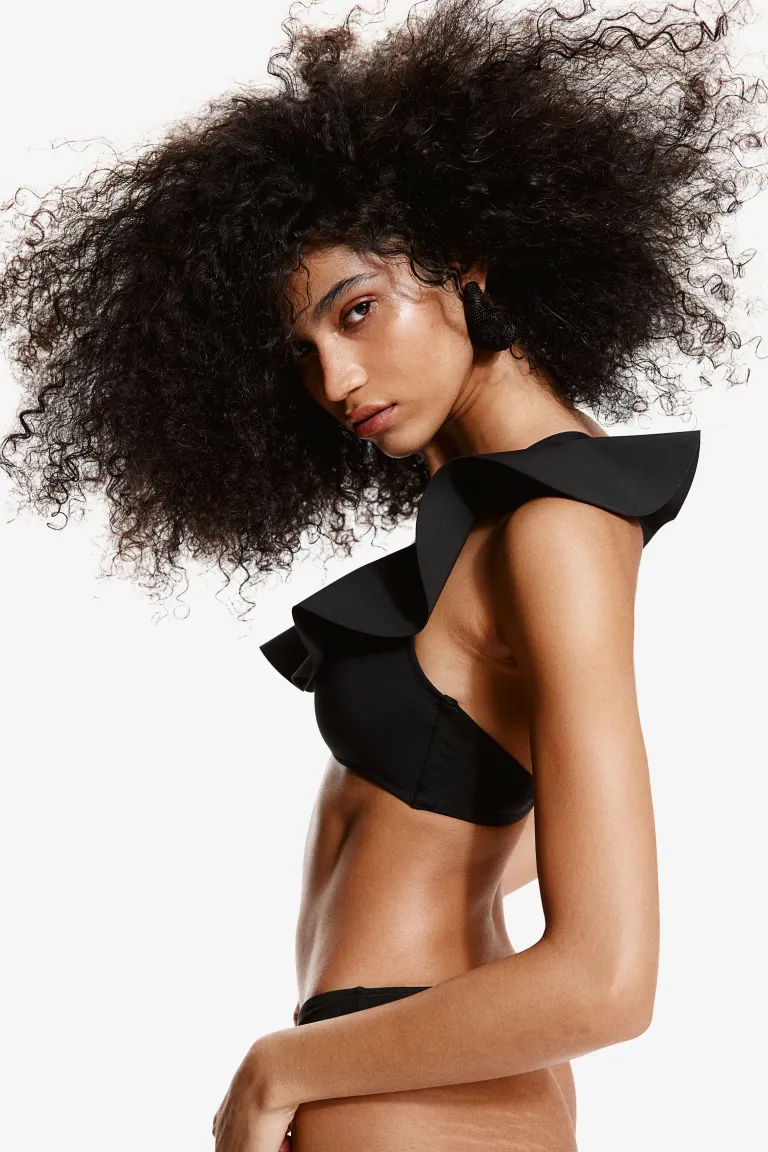 Лиф бикини без косточек на подкладке, с асимметричным вырезом и широкой оборкой спереди, переходящей через одно плечо и прикрепленной к узкому регулируемому бретелю сзади. Чашки со съемными вставками, которые придают груди форму и обеспечивают хорошую поддержку. Боковая поддержка и металлическая пряжка сзади. Фильм: Бюстгальтер без косточек, на одно плечо, с мягкой подкладкой Вырез: Асимметричный вырез