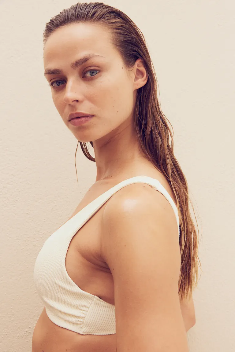 Верх бикини на подкладке с мягкими чашками, которые визуально увеличивают грудь и создают красивое декольте. Верх имеет широкие регулируемые бретели и металлическую застежку сзади.
