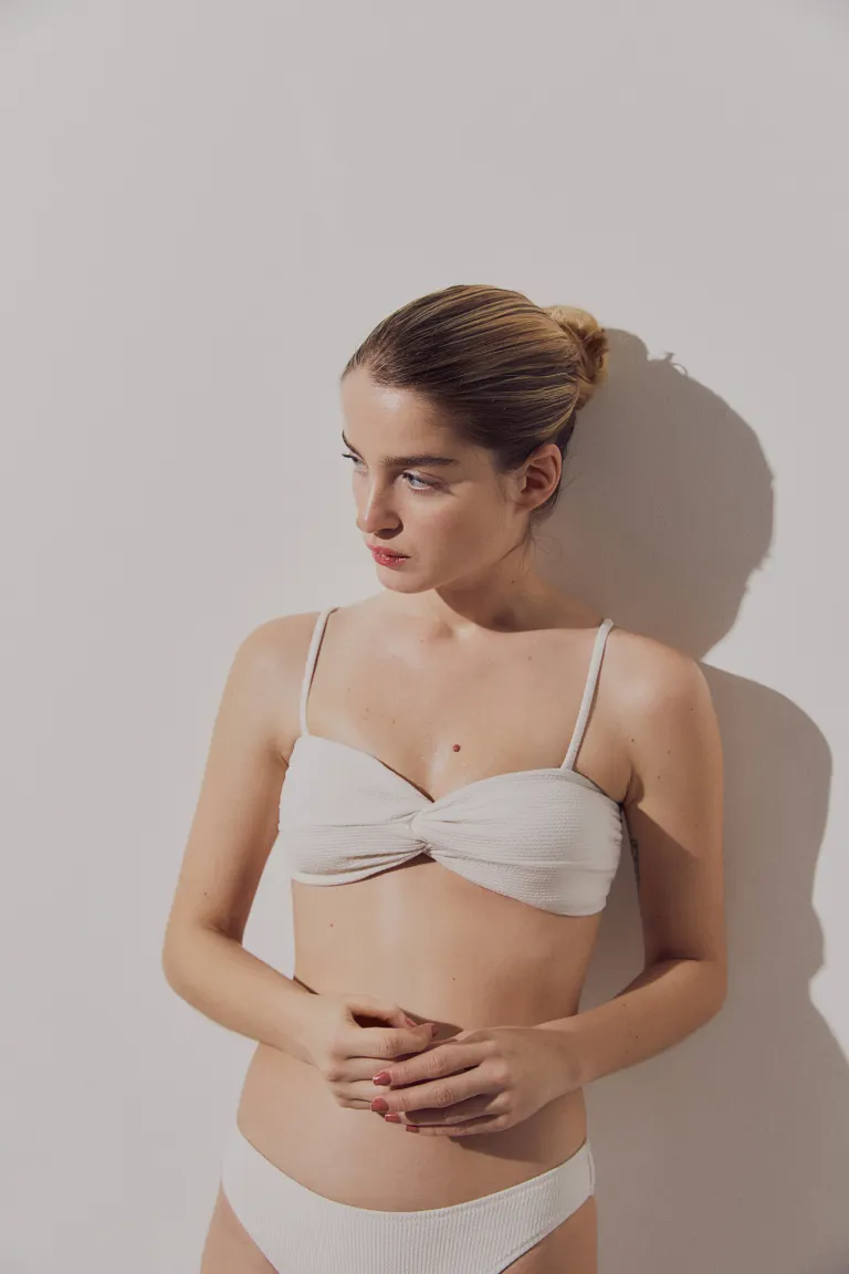 Верх бикини без косточек на подкладке из структурированной ткани. Узкие регулируемые бретели, закрученная деталь спереди и чашки со съемными вставками, которые формируют грудь и обеспечивают хорошую поддержку. Без застежек.