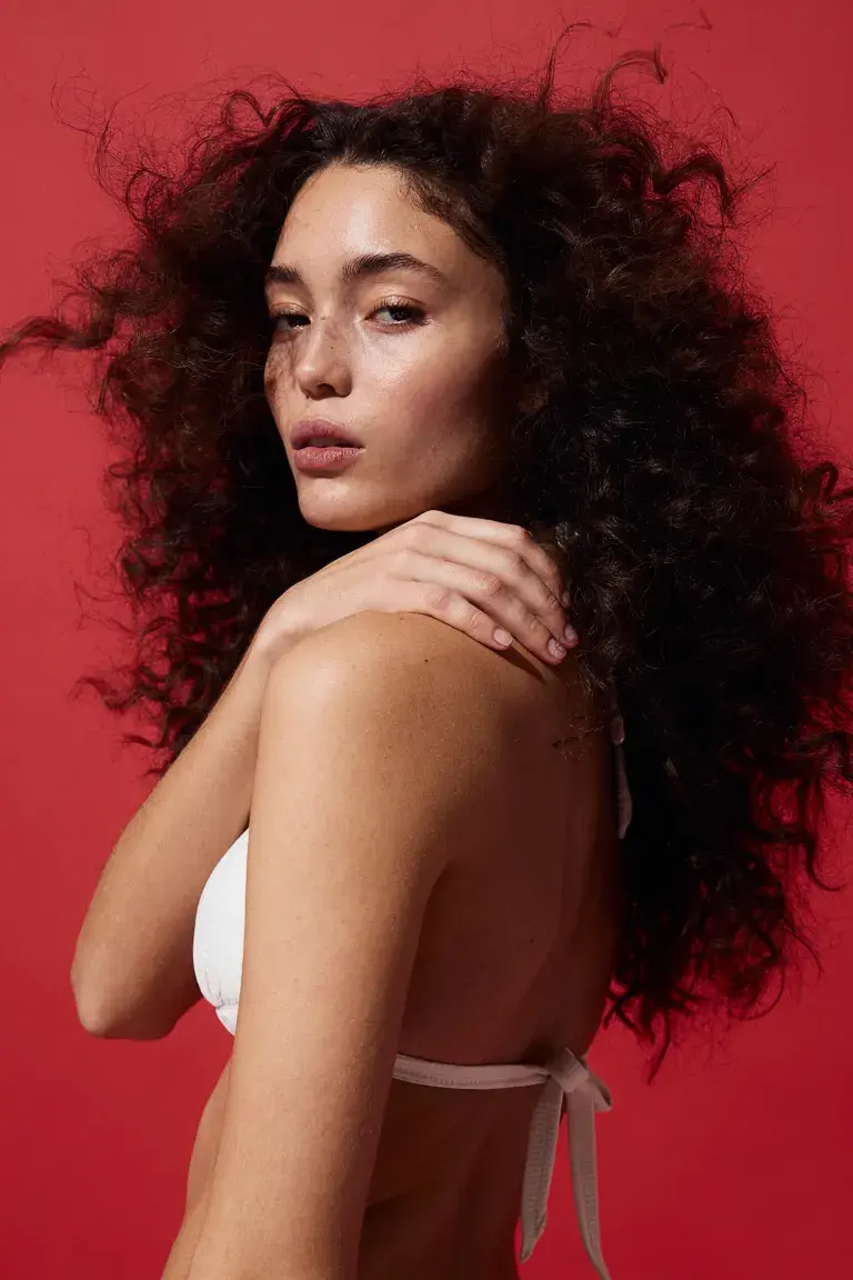 Треугольный лиф бикини без косточек на подкладке и с мягкими чашками, которые визуально увеличивают грудь и создают красивое декольте. Завязки на спине и двойные завязки на шее.
