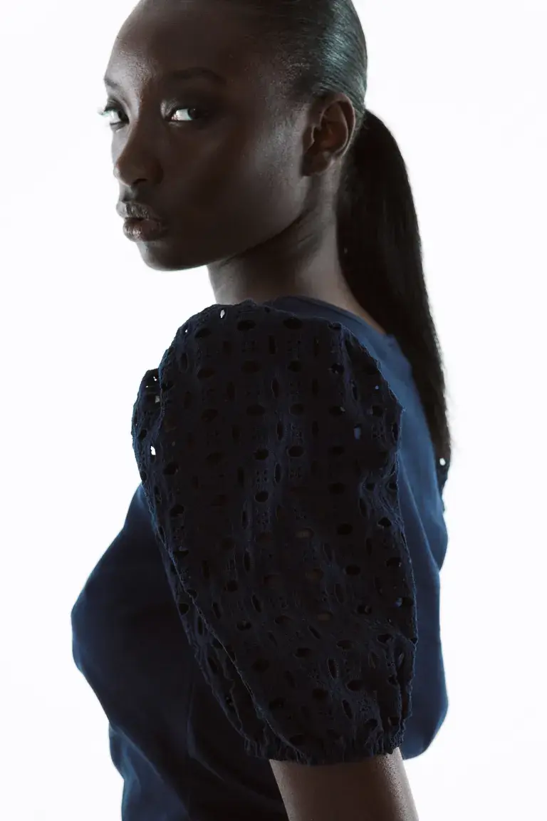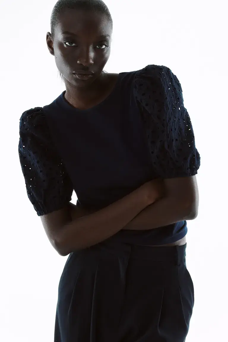 Рубашка из мягкого хлопкового трикотажа с круглым вырезом и короткими рукавами-фонариками из хлопкового поплина с узкой резинкой на манжетах.