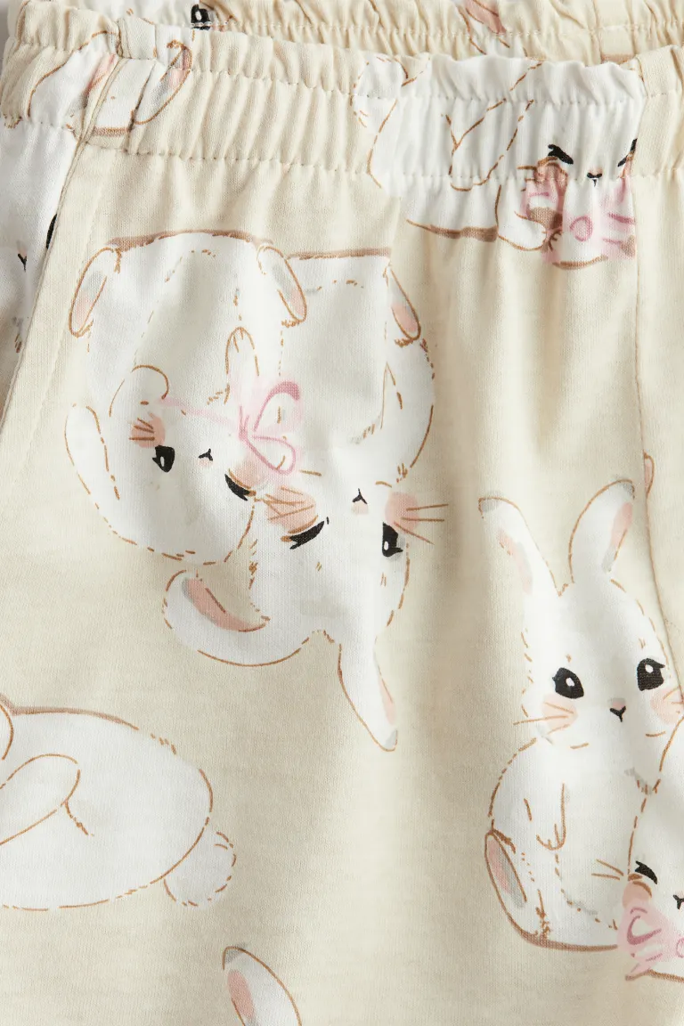 Шорты из мягкого хлопкового трикотажа с принтом по всей поверхности. Эластичный пояс в виде бумажного пакета с воланом и косыми передними карманами.