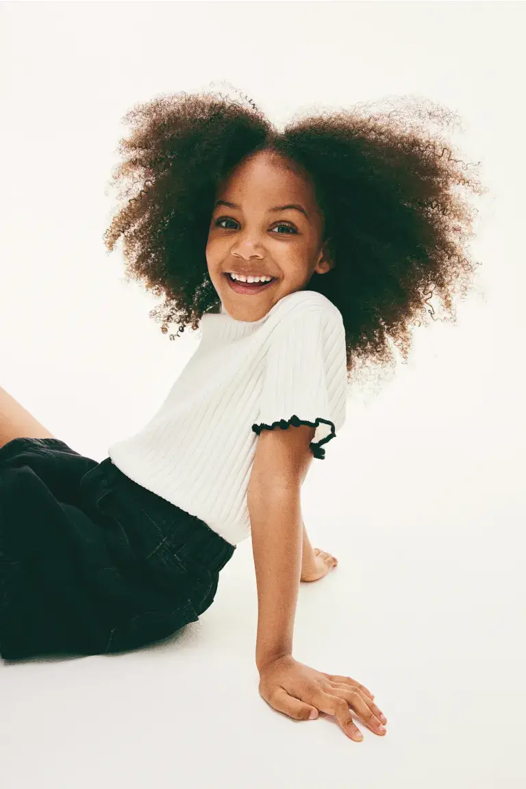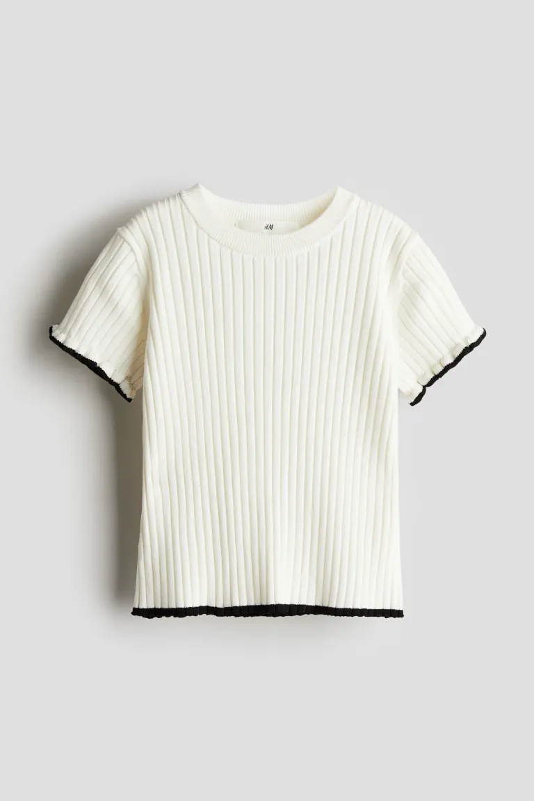 Рубашка с короткими рукавами из мягкого ребристого трикотажа с круглым вырезом, воланами на манжетах и прямым низом.