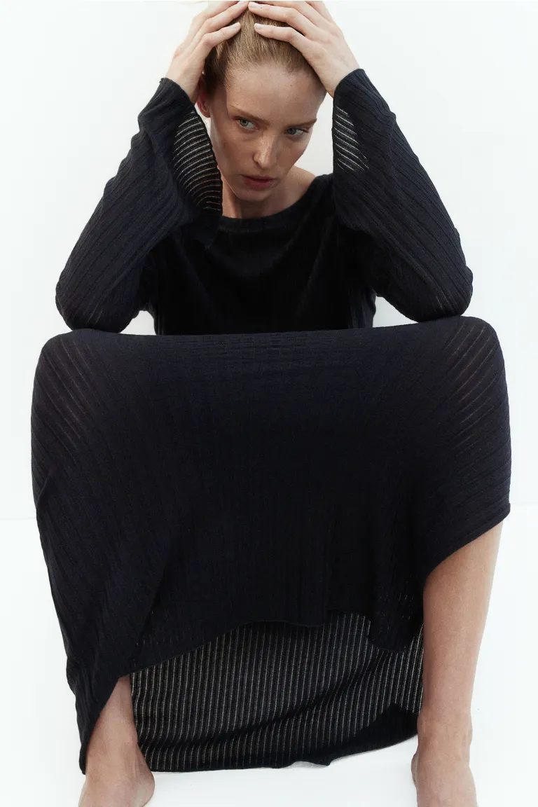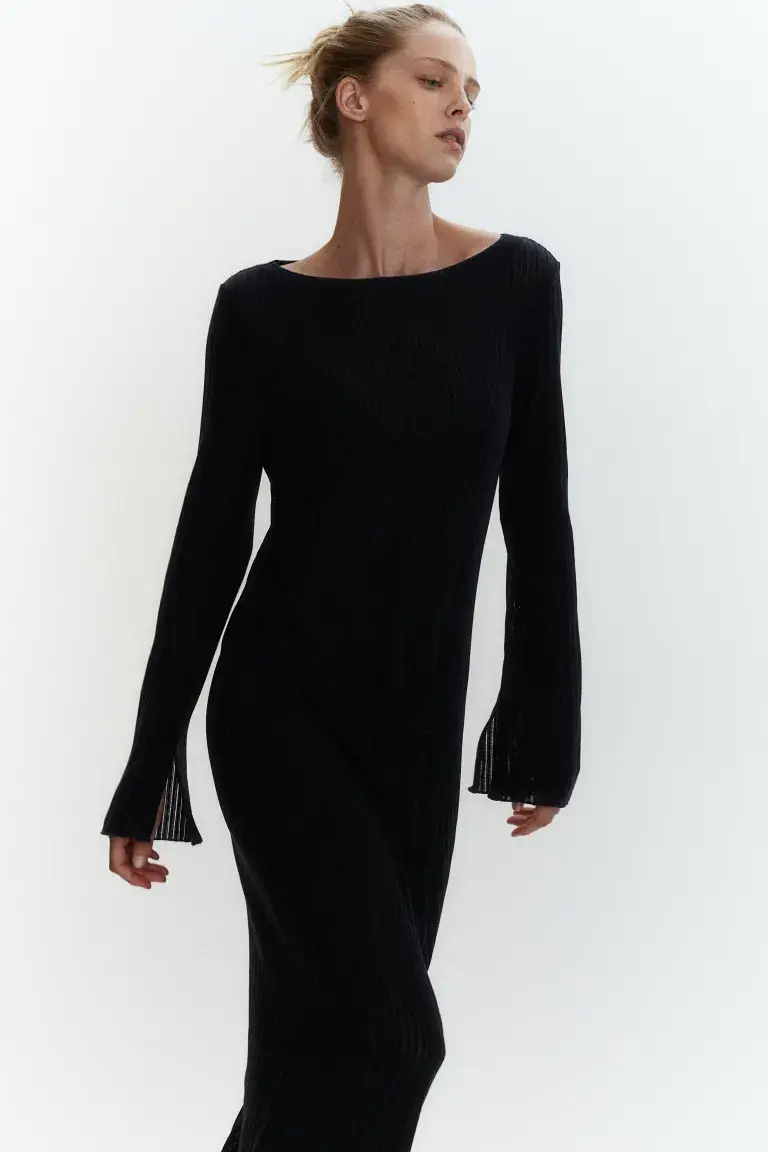 Новинка Длинное облегающее фигуру платье из прозрачного рубчатого трикотажа с вырезом-лодочкой и удлиненными расклешенными рукавами. Края оверлочные, разрез на манжетах и по нижнему краю. Размер: Рукава: Длина: 67,0 см (размер M), Разрез: Длина: 35,0 см (размер M), Плечо: Ширина: 38,0 см (размер M). ), Спереди: Длина: 138,0 см (размер M) Длина: Длинная Длина рукава: Очень длинные рукава Посадка: Приталенная Фильм: Разрез Вырез: Вырез «лодочкой»