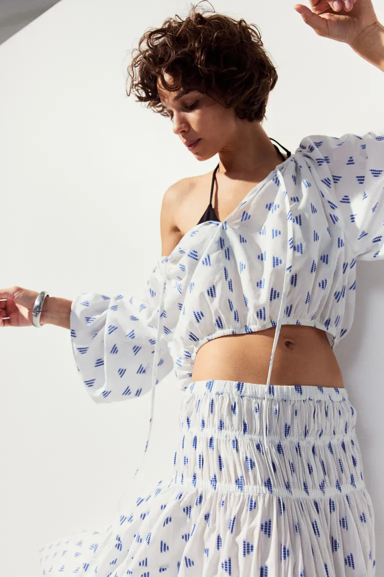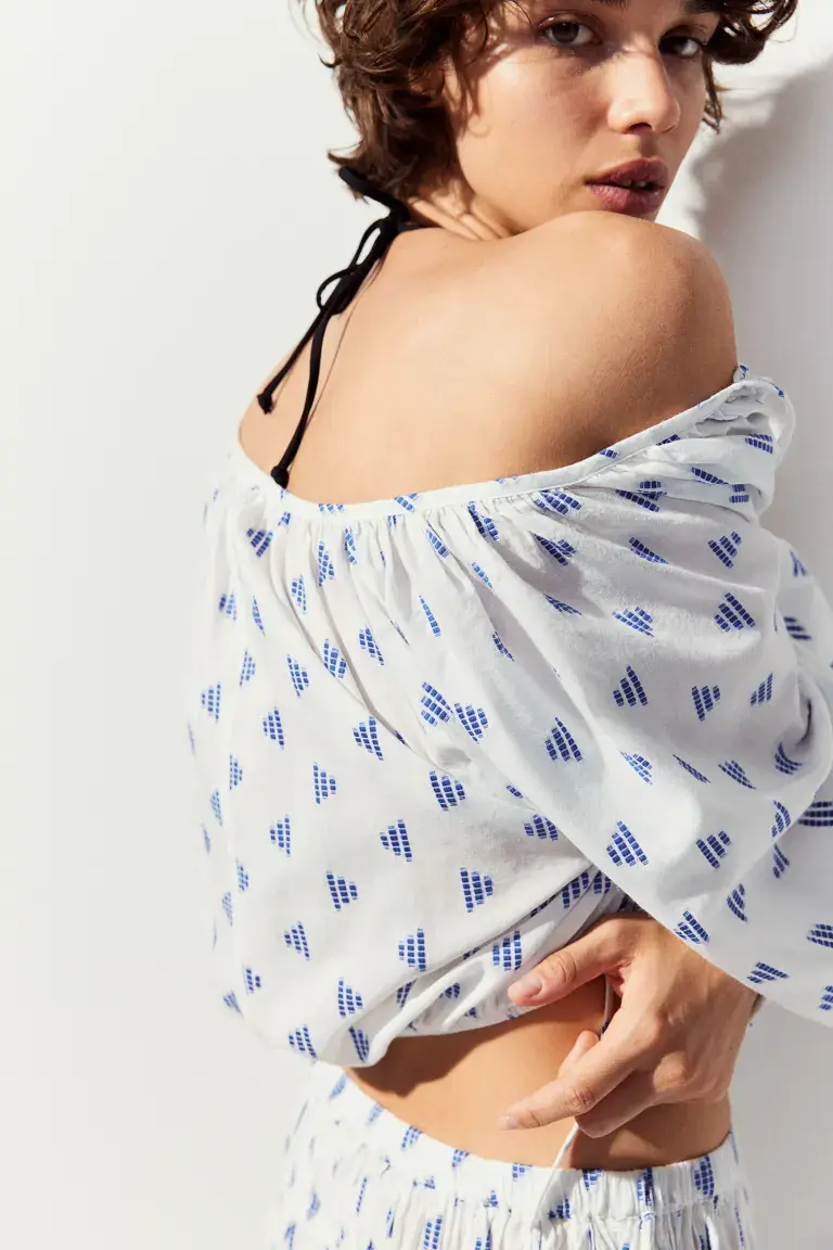 Новинка Короткая блузка из тканого материала с круглым вырезом и V-образным вырезом на узких завязках спереди. Свободная посадка. Длинные рукава-фонарики кроя реглан с узкой резинкой на манжетах и узкой резинкой по нижнему краю. Размер: Рукава: длина: 69,5 см (размер М), спинка: длина: 39,5 см ( размер M) Длина: Короткая Длина рукава: Длинный рукав Посадка: Свободная посадка Фильм: Замочная скважина Вырез: Круглый вырез Фильм рукава: Рукава-баллон, Рукава реглан