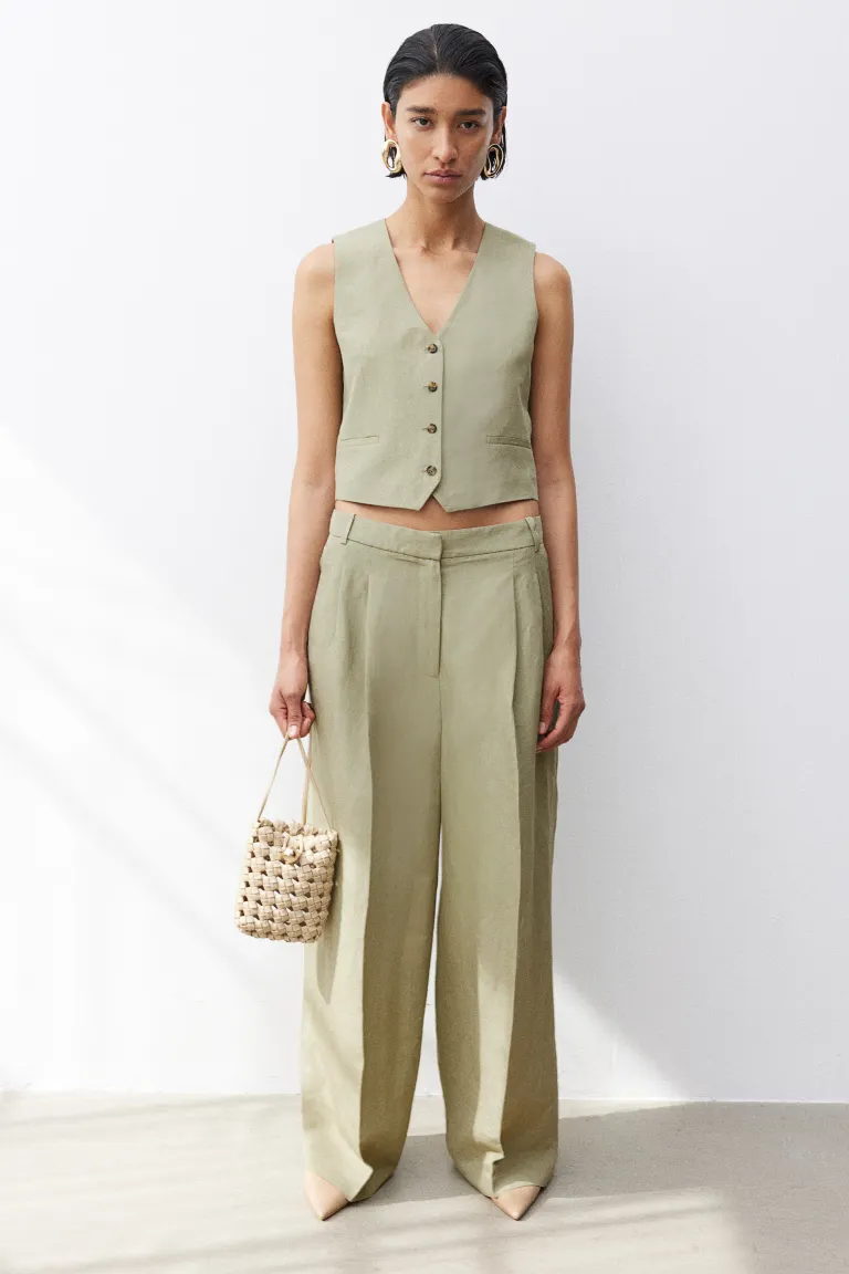 Новинка Элегантные брюки со складками из смеси льна и вискозы. Высокая талия, застежка на молнию, потайную пуговицу и крючок. Свободная посадка. Косые боковые карманы и ложные прорезные карманы сзади. Широкие прямые брючины со складками спереди и сзади. Размер: Внутренняя часть штанины: длина: 73,5 см (размер 40), талия: окружность 80,5 см (размер 40) Длина: длинная Высота талии: Высокая талия Посадка: Свободный крой Фильм: Широкий