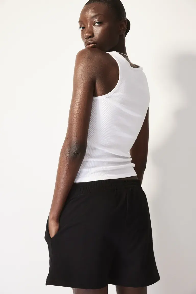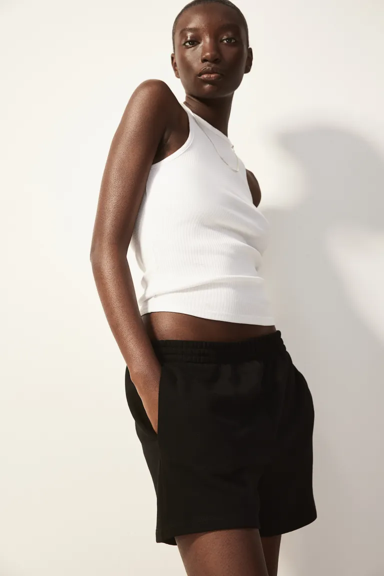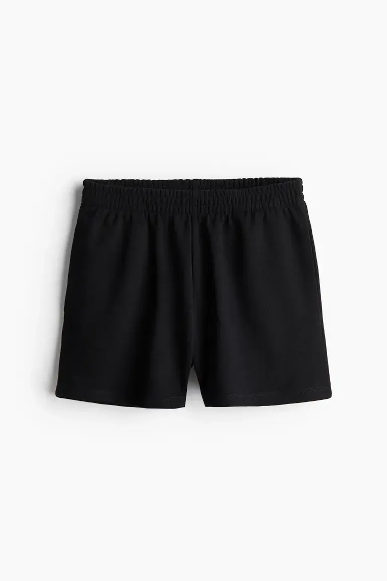 Шорты из трикотажа с эластичным присборенным поясом и незаметными карманами в боковых швах.
