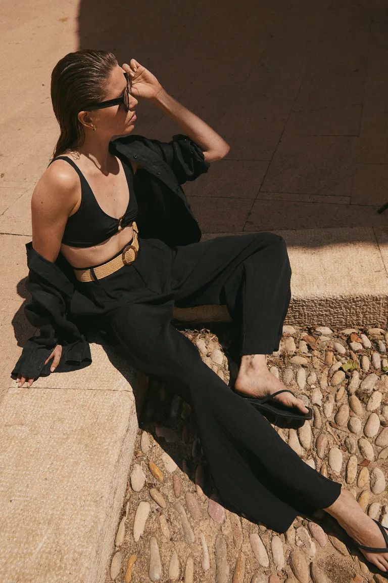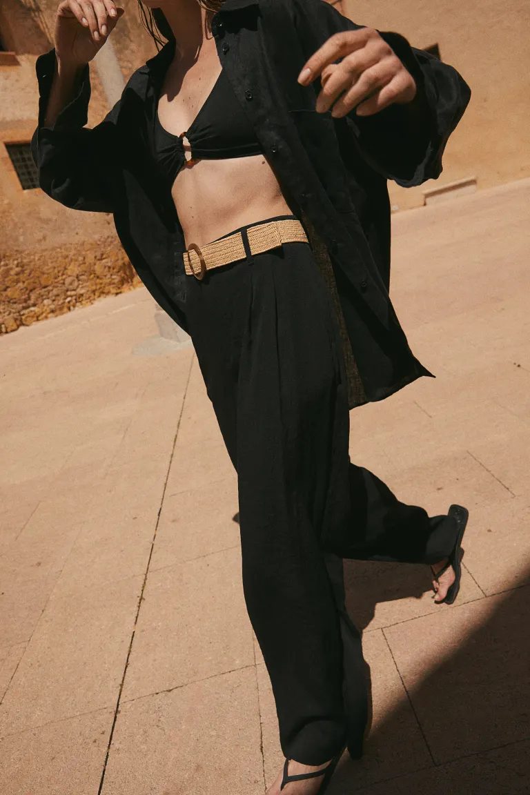 Новинка Тканевые брюки с высоким поясом, застежкой-молнией и потайным крючком, а также широким плетеным ремнем с круглой пряжкой. Неброские боковые карманы, прорезные карманы сзади и широкие брючины со складками спереди. Свободный крой. Размер: Талия: окружность: 80,0 см (размер 40), внутренняя часть штанины: длина: 76,0 см (размер 40) Длина: длинная Высота талии: завышенная талия Посадка: Свободная посадка Фильм: Широкая
