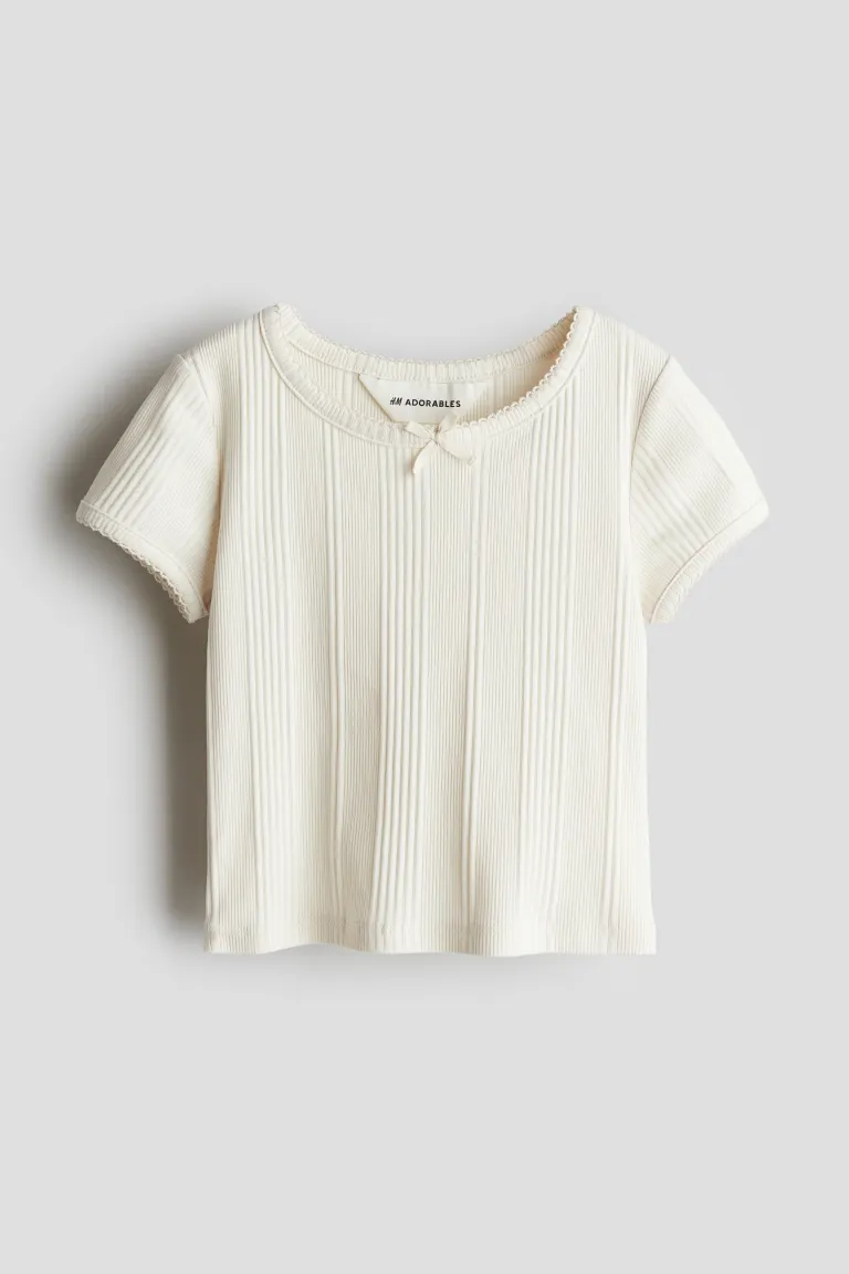 Прелести H&M. Рубашка с короткими рукавами из мягкого хлопкового трикотажа в рубчик с изящной отделкой пико. Круглый вырез с небольшим атласным бантом.