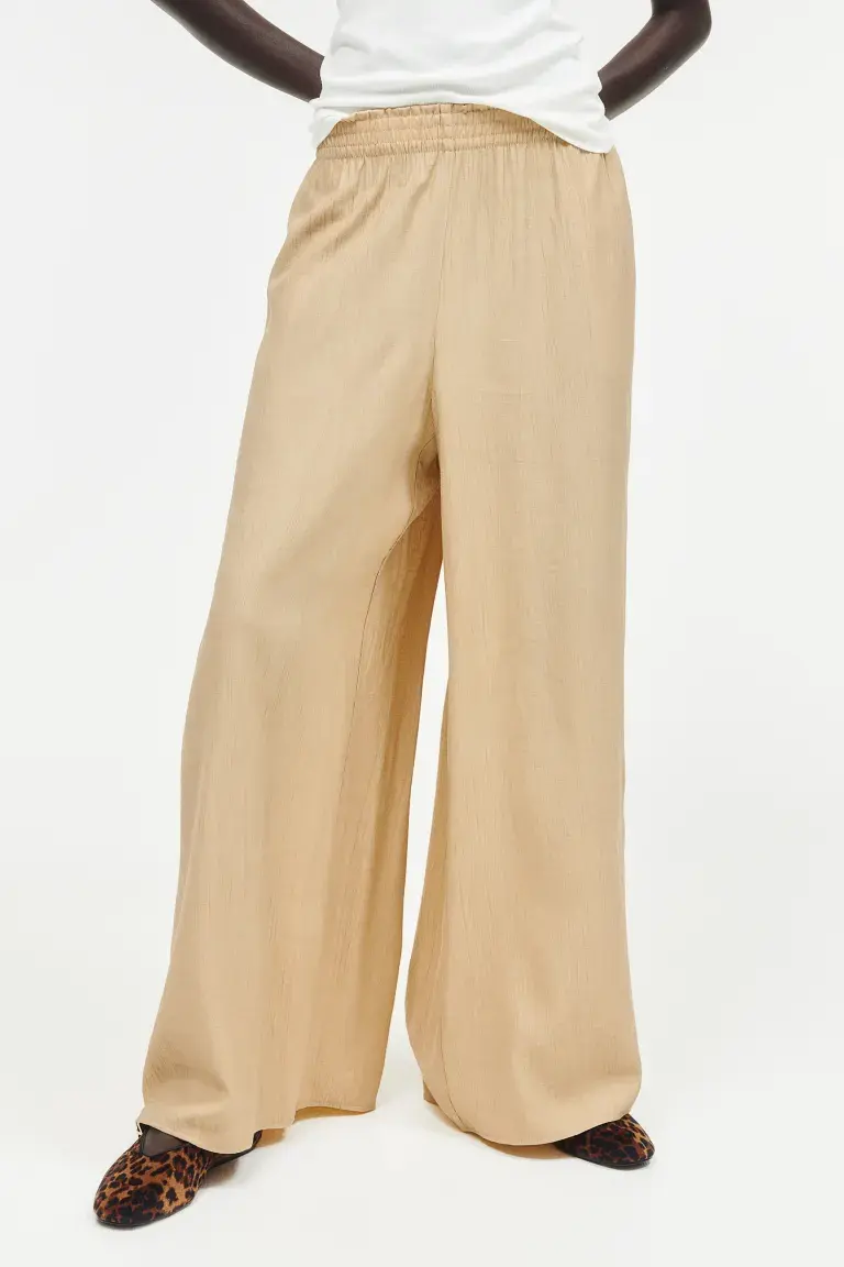 Брюки повседневного кроя из мятой ткани с высоким эластичным поясом и широкими штанинами.