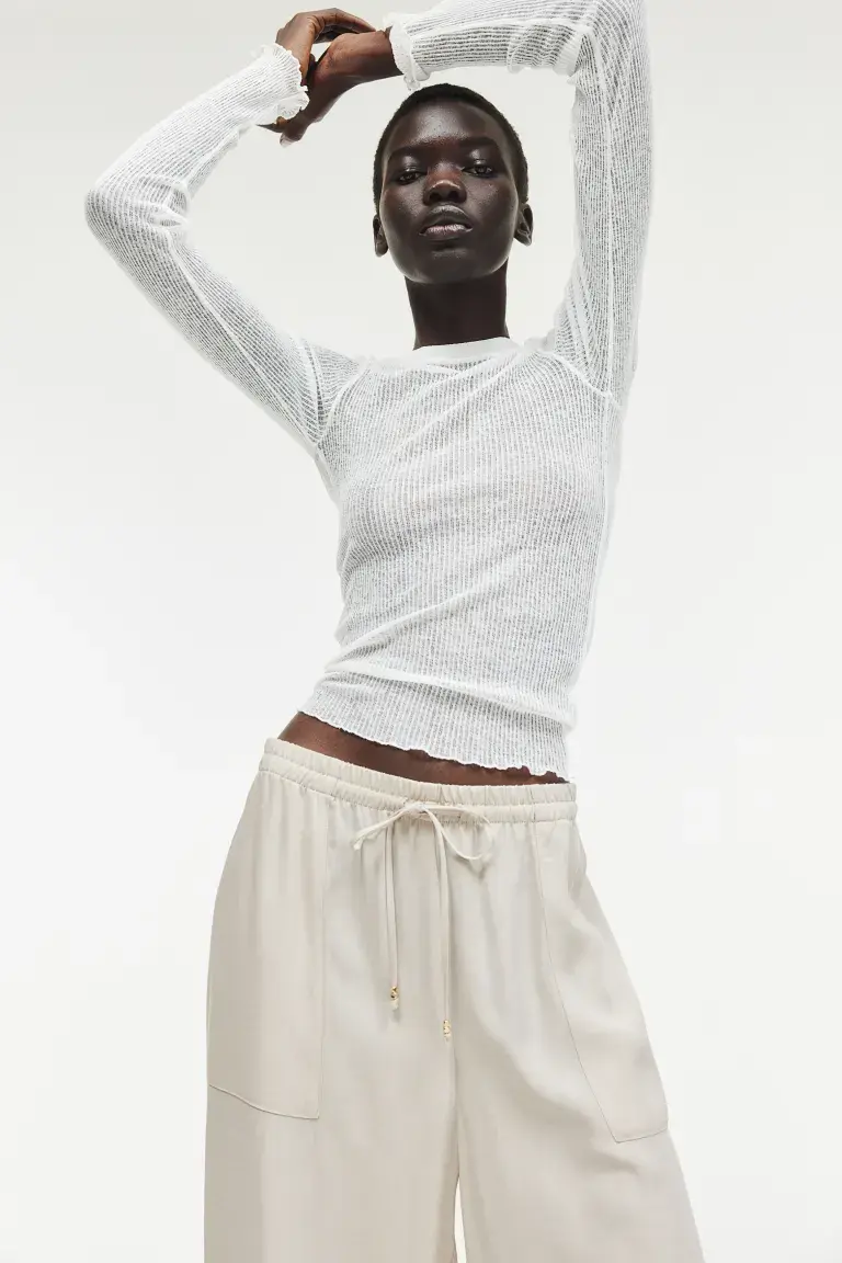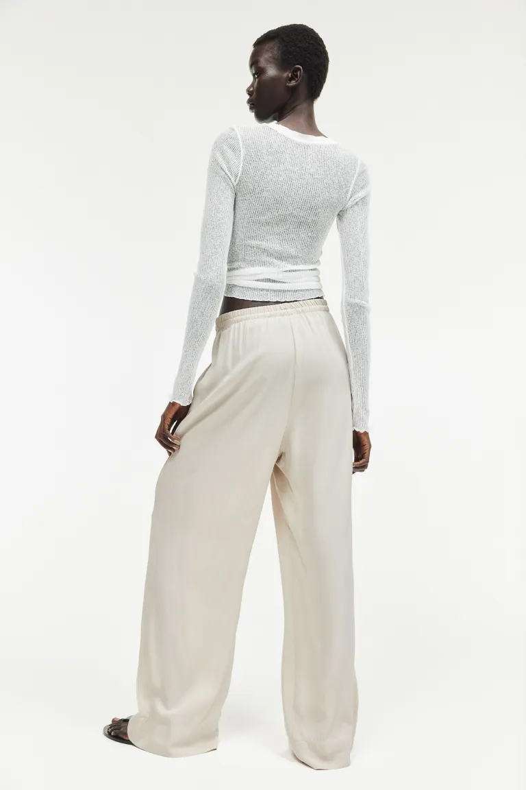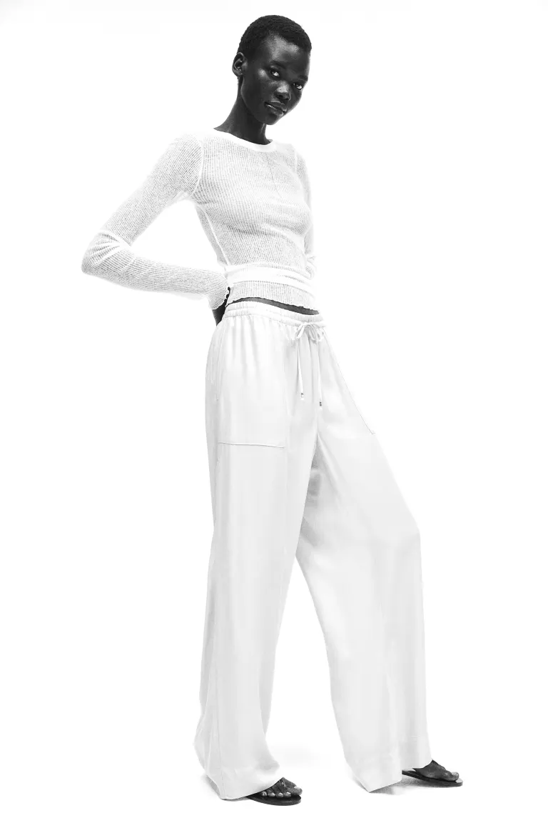 Новинка Брюки из мягкого вискозного твила свободного кроя с высоким эластичным поясом с узкой кулиской, на концах которой металлические бусины кубической формы. Накладные карманы с тонкими боковыми отверстиями и широкими прямыми брючинами. Размер: Внутренняя часть штанины: Длина: 77,5 см (размер M) Длина: Длинная Высота талии: Высокий пояс Посадка: Свободный крой Фильм: брюки-палаццо, прямые брючины