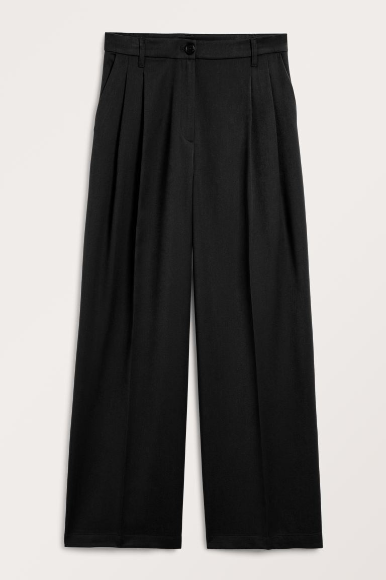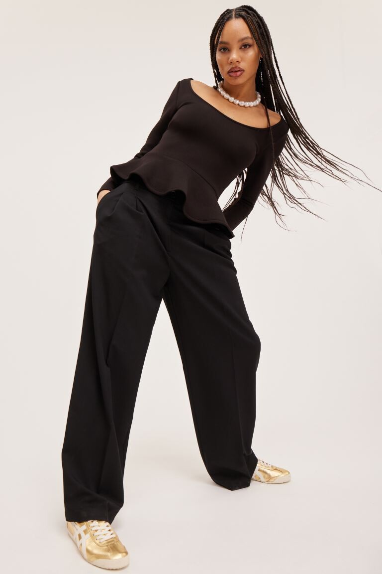Широкие брюки с высокой талией, складками спереди для дополнительного объема, петлями для ремня и боковыми карманами