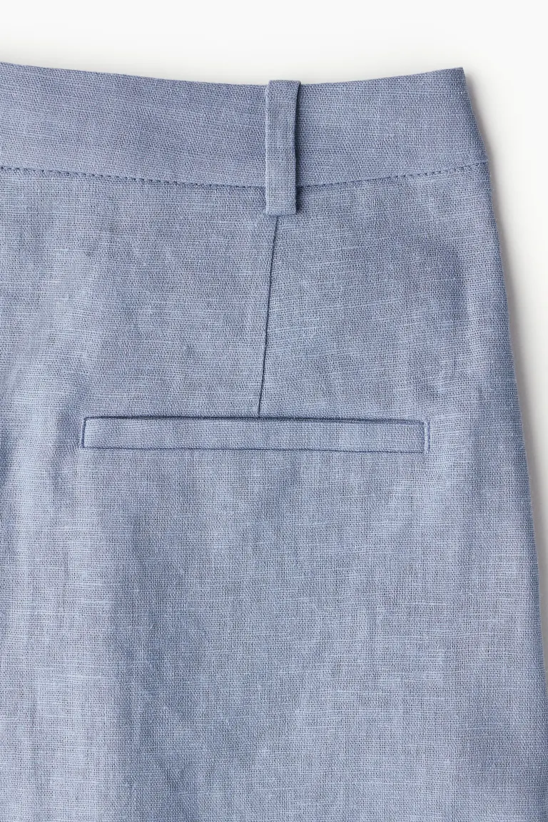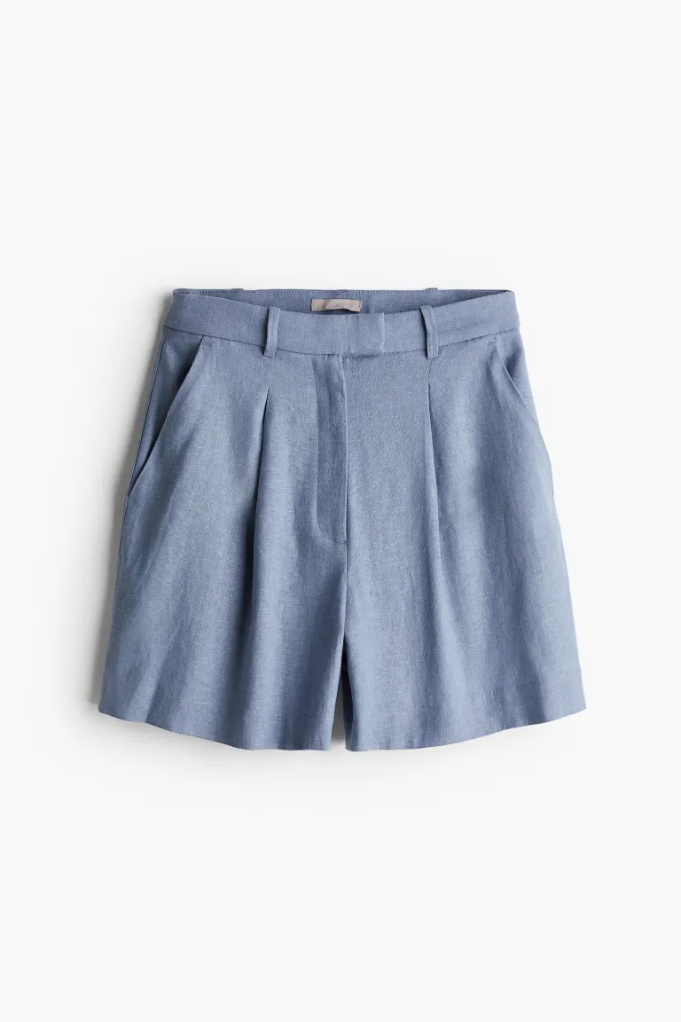 Шорты свободного кроя со складками из воздушной смеси льна и вискозы. Высокая талия, ширинка на молнии и клапан на потайной пуговице и крючке. Косые боковые карманы и ложные прорезные карманы сзади. Размер: Внутренняя часть штанины: длина: 11,5 см (размер 40), талия: окружность 79,5 см (размер 40) Длина: короткая Высота талии: завышенная талия Посадка: Свободный крой Фильм: шорты-бермуды