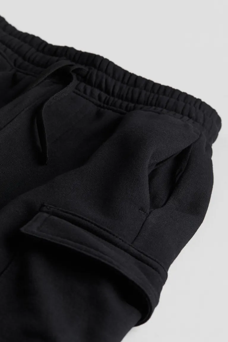 Шорты-Карго длиной до колена из трикотажной ткани с мягким начесом внутри. Эластичный пояс с кулиской и ложной ширинкой, косые боковые карманы и карманы на штанинах с клапаном.