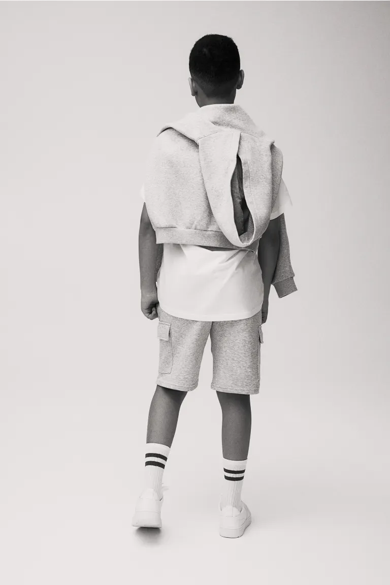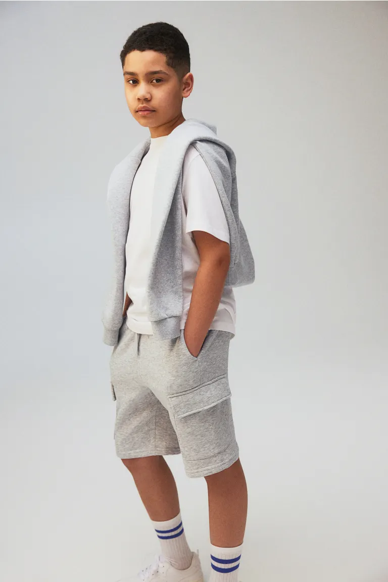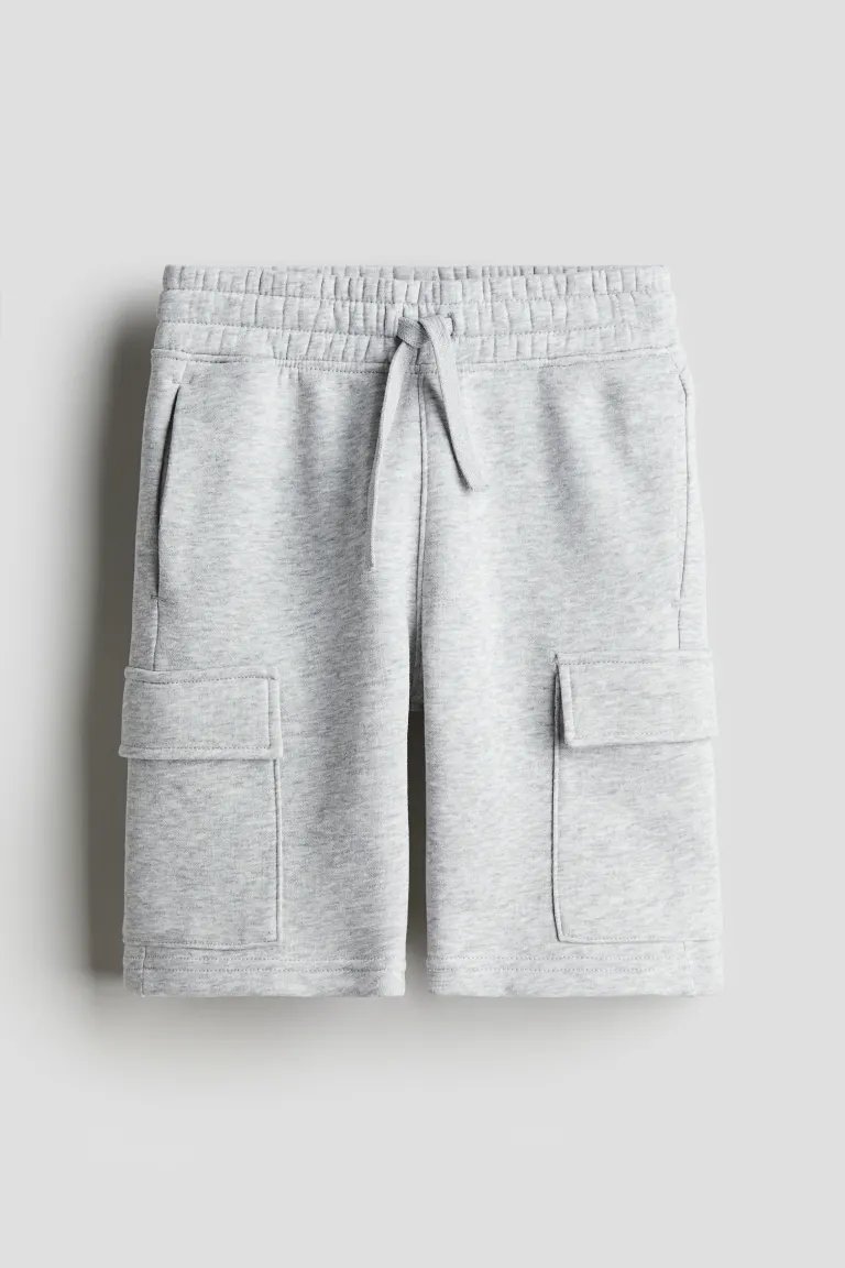Шорты-Карго длиной до колена из трикотажной ткани с мягким начесом внутри. Эластичный пояс с кулиской и ложной ширинкой, косые боковые карманы и карманы на штанинах с клапаном.