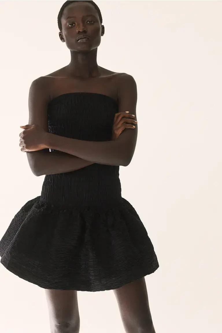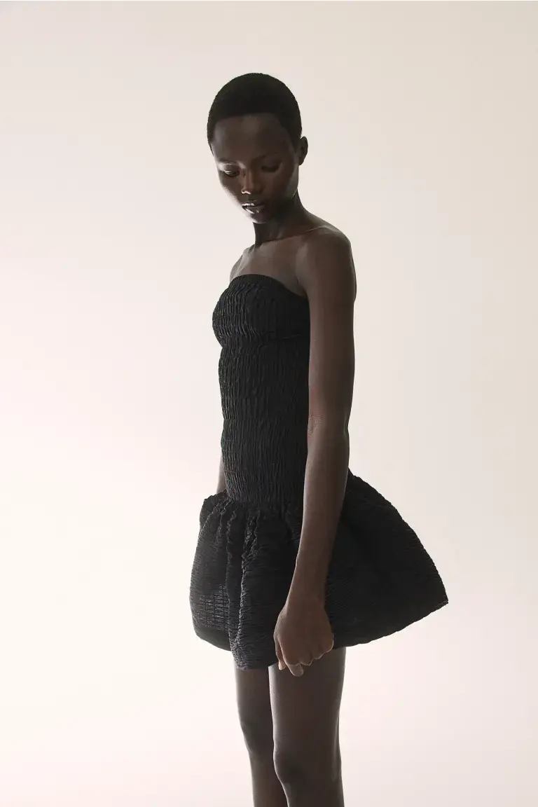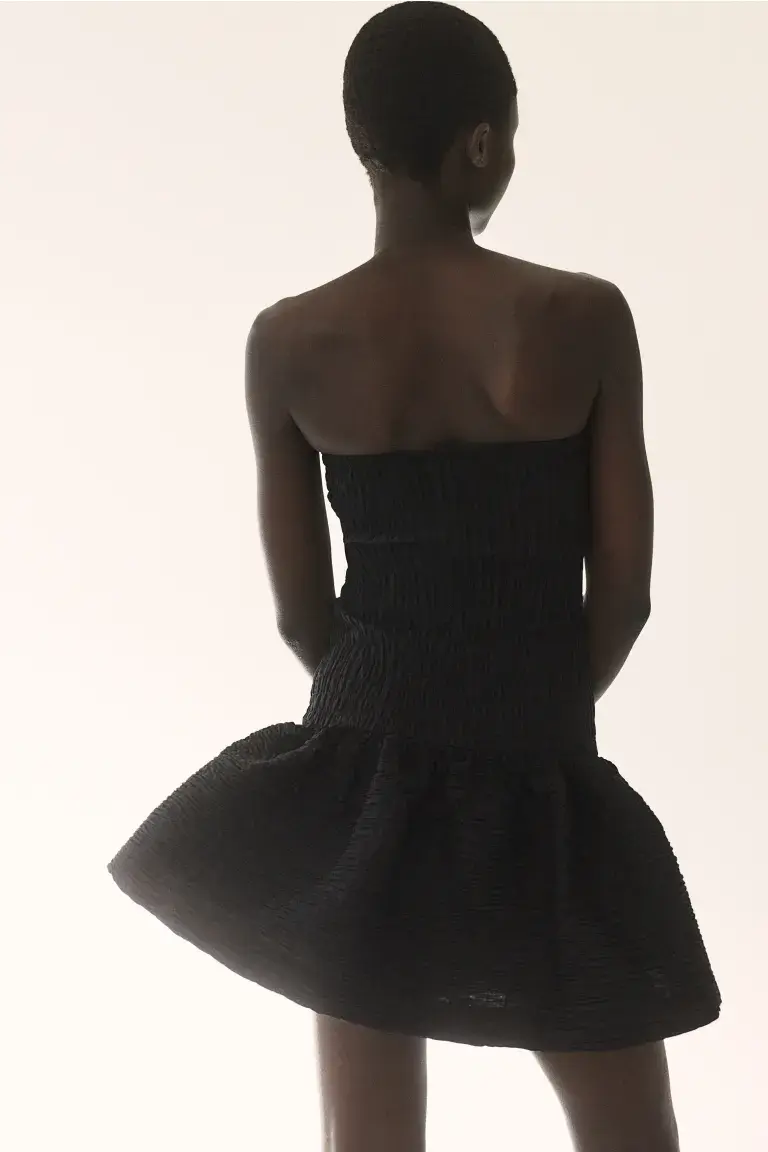 Короткое платье-бандо со сборками из хлопкового поплина. Приталенный топ на потайной резинке сверху и расклешенная юбка. Без подкладки.