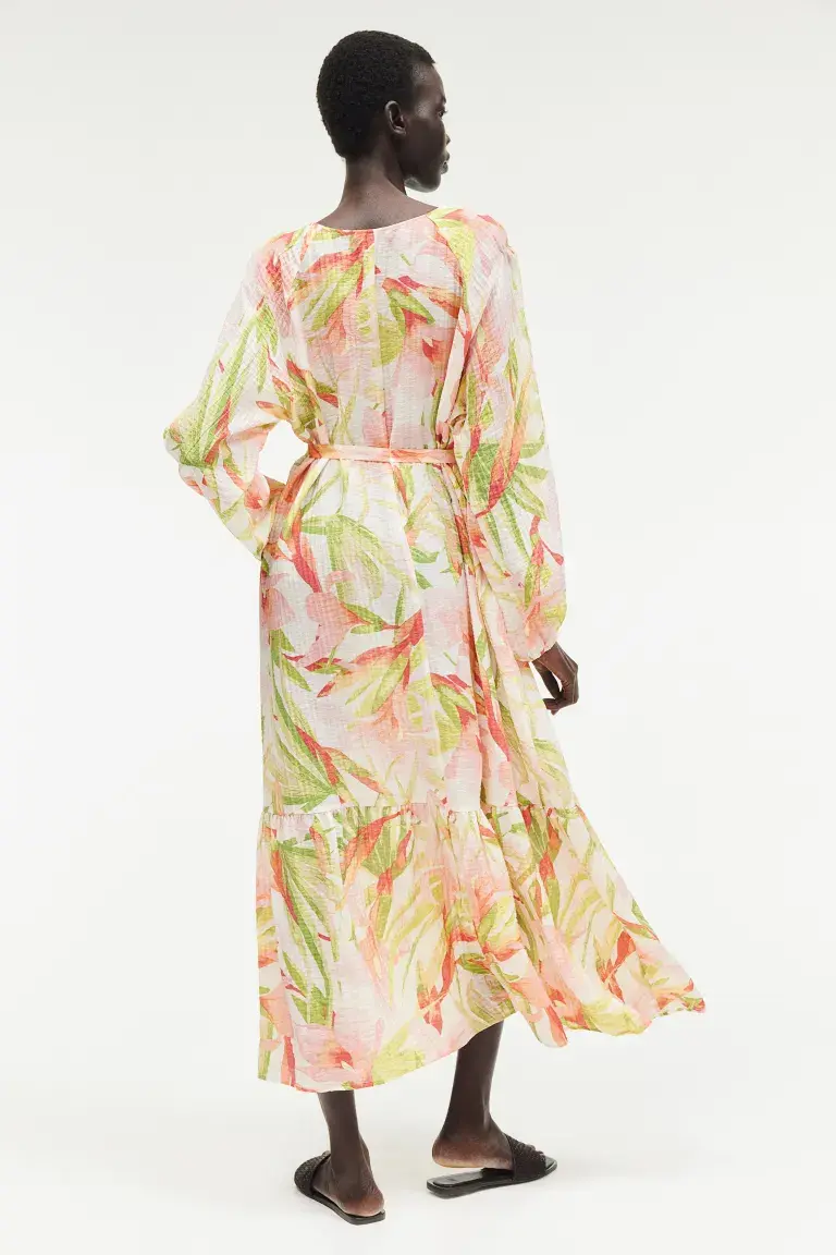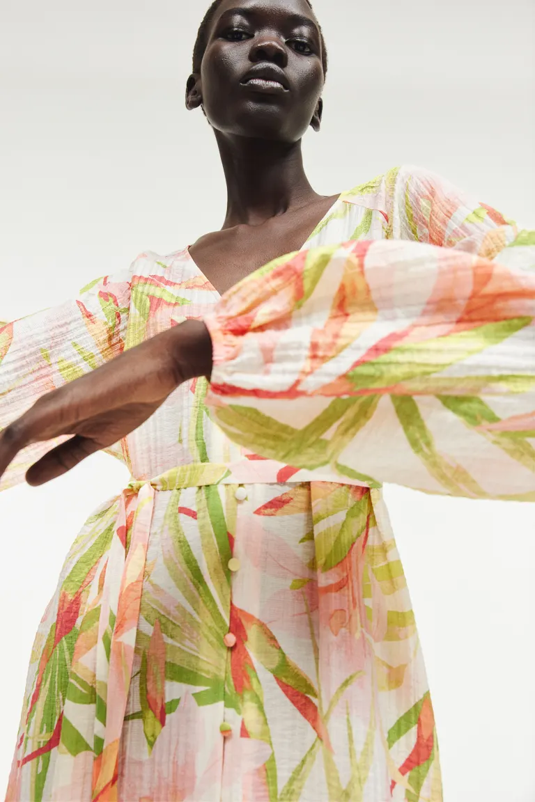 Новинка Платье из крепа длиной до щиколотки, с V-образным вырезом, обтянутыми пуговицами спереди и съемным поясом на талии. Длинные рукава-фонарики кроя реглан с узкой резинкой на манжетах. Присборка над нижним краем для дополнительного объема. Без подкладки. Размер: Спинка: Длина: 133,5 см (размер M), Рукав: Длина: 72,5 см (размер M) Длина: Длинная Длина рукава: Длинный рукав Посадка: Обычный крой Вырез: V-образный Фон рукавов: объемные рукава, рукава реглан