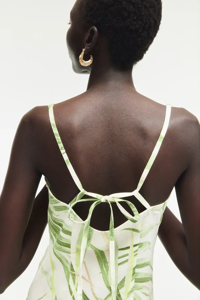 Новинка Короткое облегающее фигуру платье из хлопкового крепа с глубоким круглым вырезом и узкими бретелями, которые протягиваются через петли и завязываются сзади. Потайная боковая молния с застежкой на крючок. Частичная подкладка. Размер: Спинка: Длина: 61,5 см (размер 40) Длина: Короткая Длина рукава: Без рукавов Посадка: Приталенная Фильм: Вырез на спине с глубоким вырезом, платье на узких бретелях Вырез: Квадратный вырез