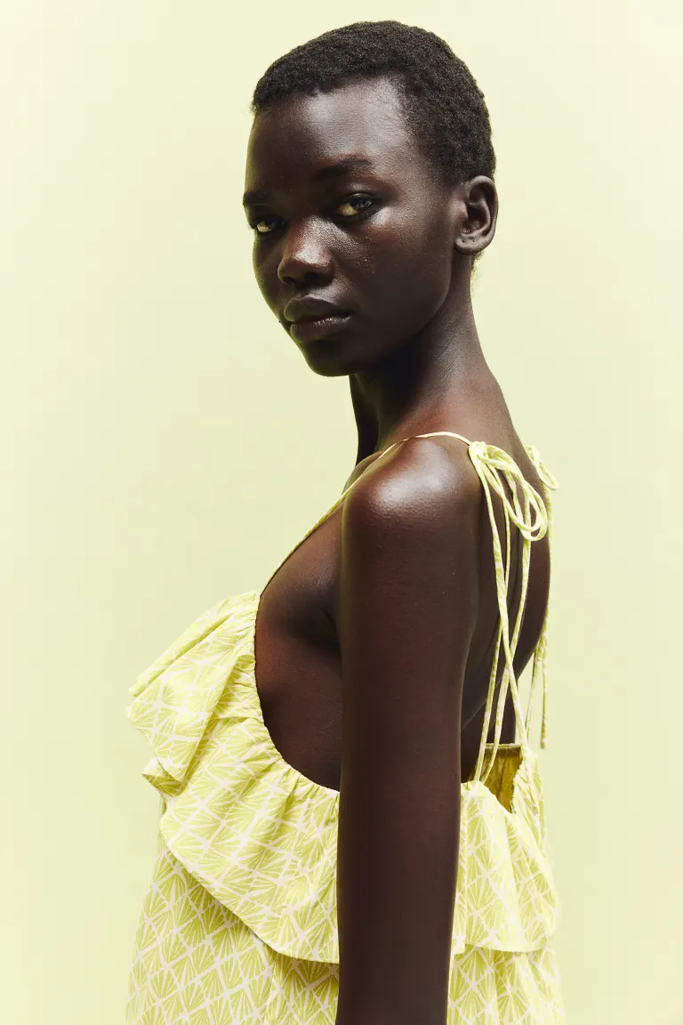 Платье свободного кроя длиной до икры из тканого материала с узкими бретелями и широкой воланной отделкой сверху. V-образный вырез спереди и узкая резинка сзади. Без подкладки.