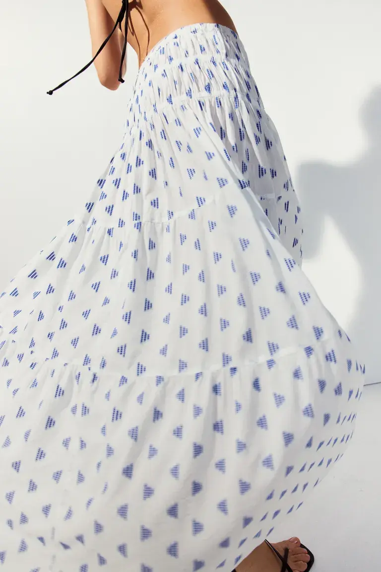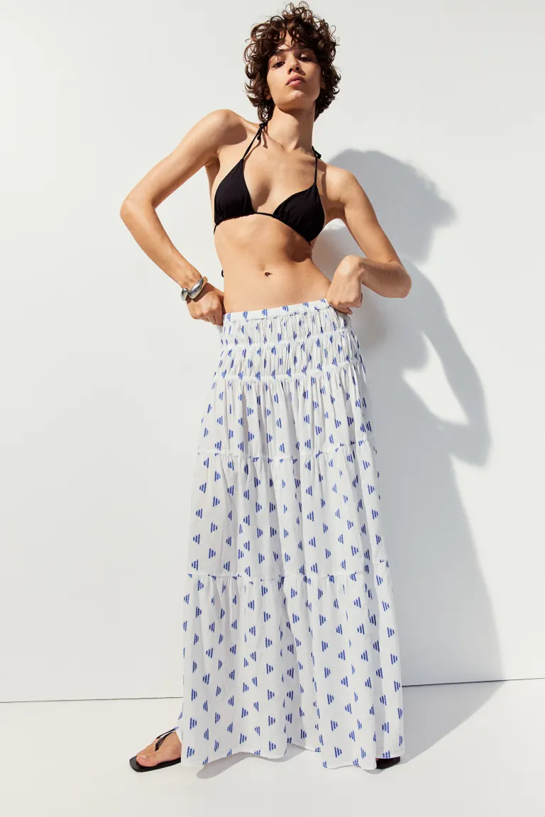 Юбка-Макси из хлопчатобумажной/модальной ткани с вышитым узором. Высокая талия со скрытой резинкой и двумя рядами узкой резинки для создания присборенного эффекта. Ярусы присборки на юбке придают дополнительный объем. Без подкладки.