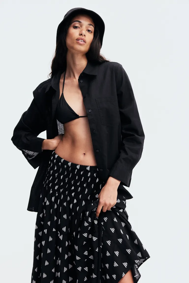 Юбка-Макси из хлопчатобумажной/модальной ткани с вышитым узором. Высокая талия со скрытой резинкой и двумя рядами узкой резинки для создания присборенного эффекта. Ярусы присборки на юбке придают дополнительный объем. Без подкладки.