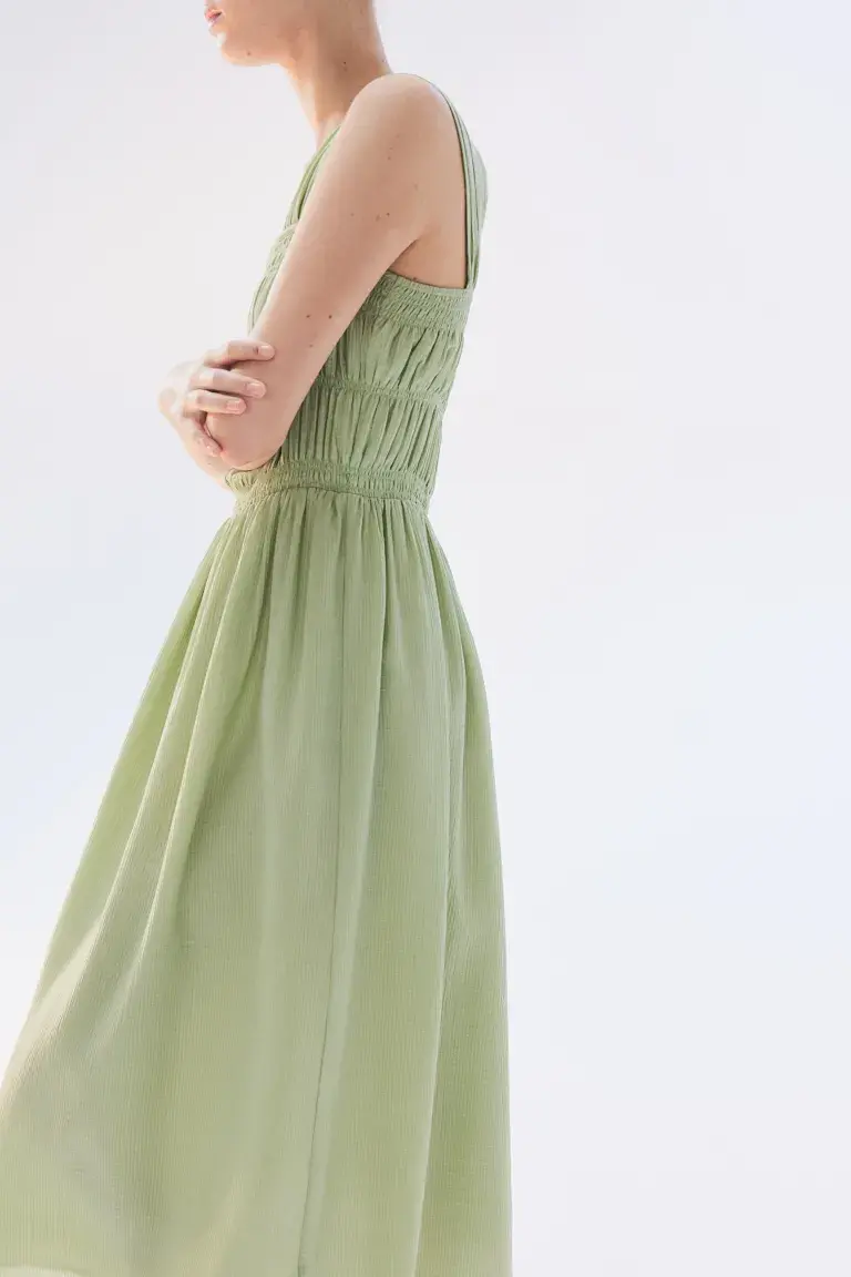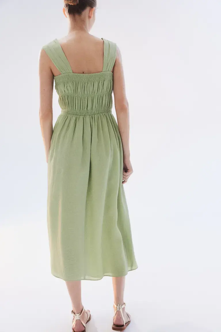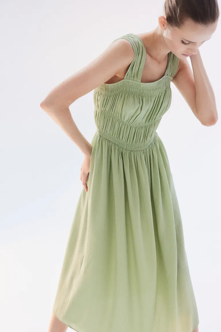 Креповое платье длиной до икры с присборенным лифом, квадратным вырезом и широкими присборенными бретелями. Прикрепленная часть юбки расклешена.