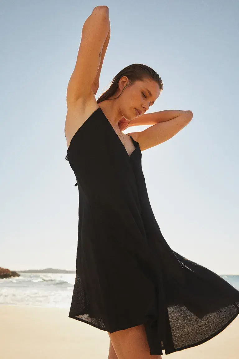 Короткое воздушное платье А-силуэта с глубоким V-образным вырезом и обтянутыми пуговицами спереди. Узкие регулируемые бретели и горизонтальные завязки сзади. Без подкладки.