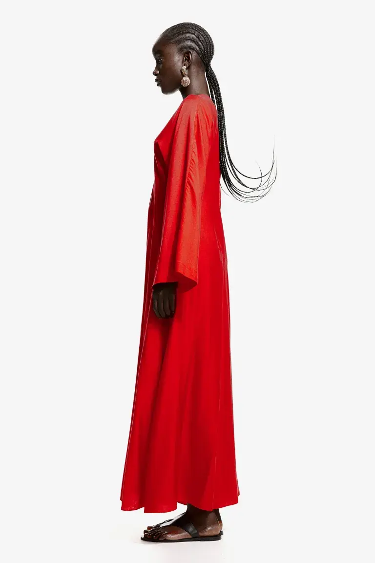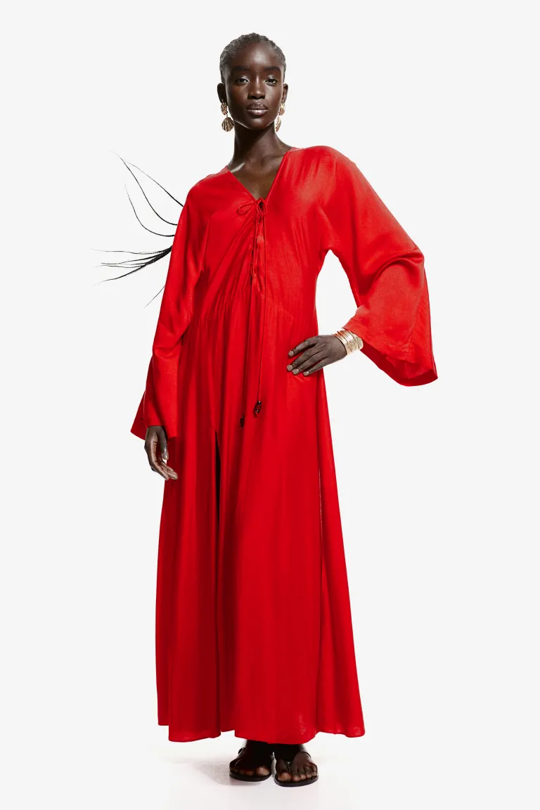 Новинка Длинное платье-кафтан из тонкой блестящей ткани. Платье имеет воздушный А-силуэт, длинные широкие рукава, глубокий V-образный вырез с изящными шлейками и длинными тонкими лентами с жемчужинами на концах. Косой шов на талии и высокий разрез спереди и по бокам. Без подкладки. Длина: Длинная Длина рукава: Длинный рукав Посадка: Обычная посадка Фильм: А-силуэт, каплевидный вырез, разрез Вырез: V-образный