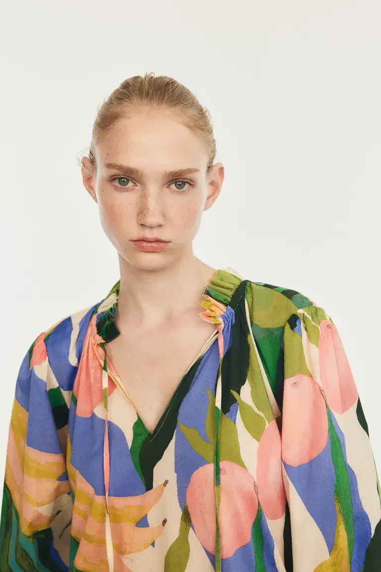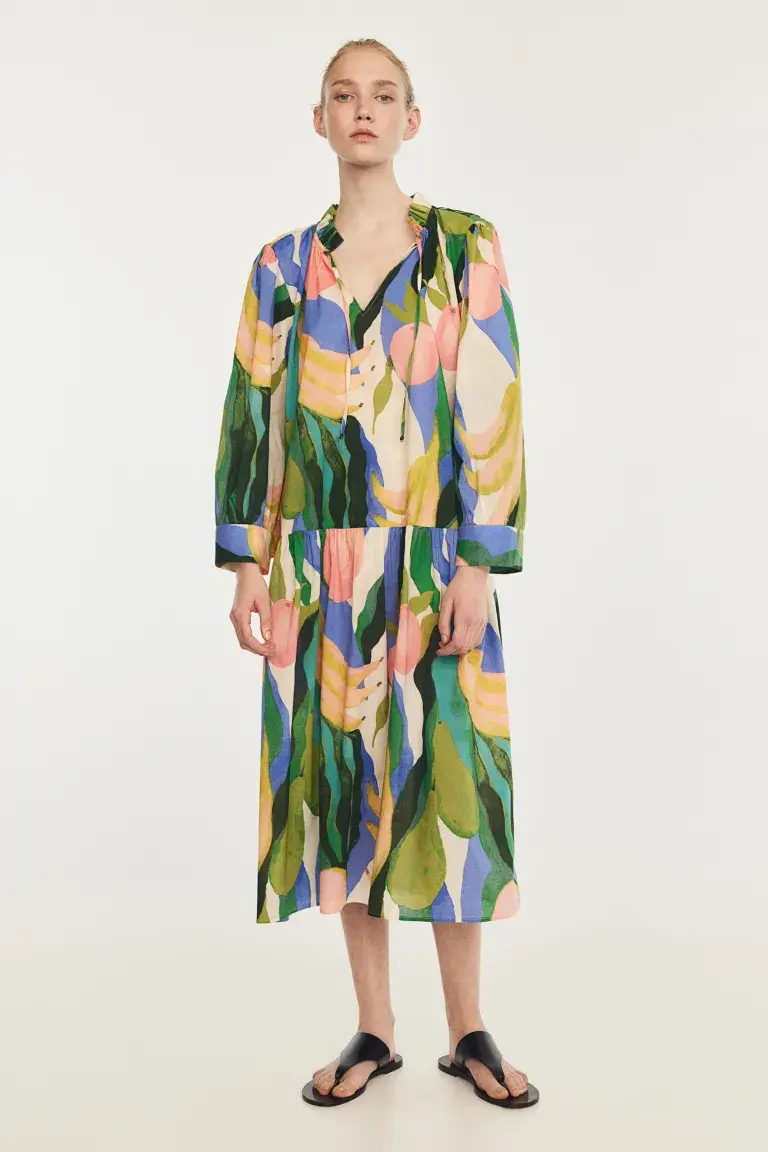 Новинка Платье длиной до икры из хлопка с воланным воротником, узкими бретелями и V-образным вырезом спереди. Рукава-фонарики с широкими манжетами и присборенным швом ниже бедер для дополнительного объема. Без подкладки. Размер: Рукав: Длина: 54,5 см (размер M), Спинка: Длина: 120,0 см (размер M), Плечо: Ширина: 39,5 см (размер M) Длина: Миди Длина рукава: длинный рукав Посадка: стандартная посадка Воротник: волан Вырез: V-образный Фон рукава: воздушный рукав