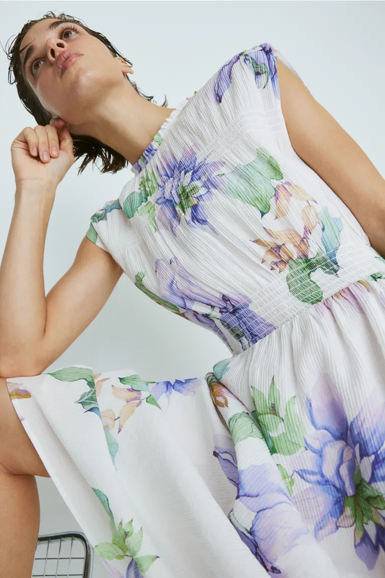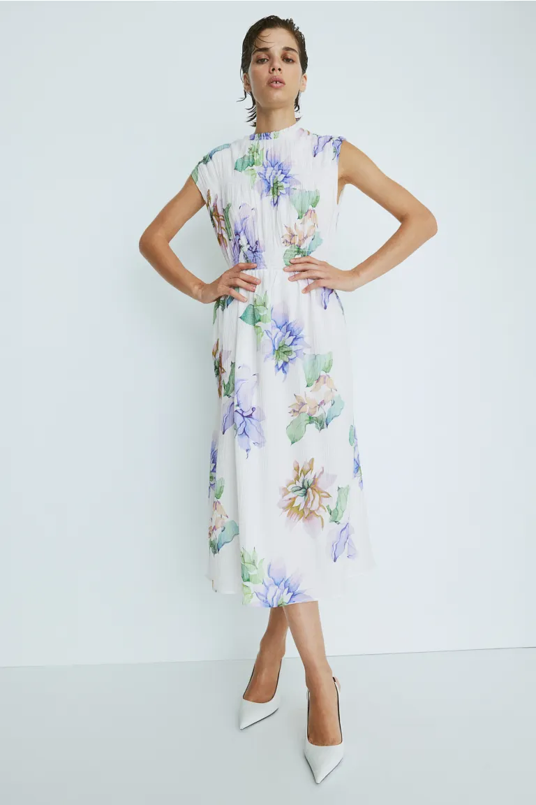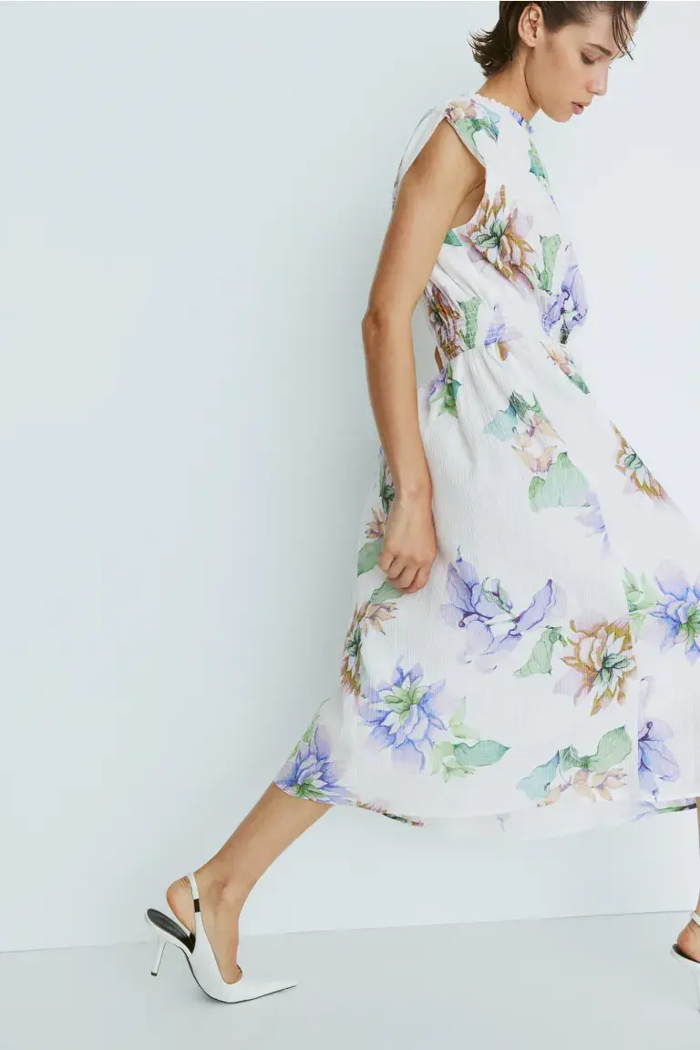 Платье без рукавов длиной до икры из тканого материала. Круглый вырез горловины с оборкой и разрезом на пуговице. Дымчатая вставка сверху и на талии для красивых рюшей. Слегка расклешенная часть юбки. Размер: Спинка: Длина: 122,0 см (размер М), Плечо: Ширина: 45,5 см (размер М) Длина: Миди Длина рукава: Без рукавов Посадка: стандартная посадка Фильм: расклешенный, присборенный Вырез: круглый вырез