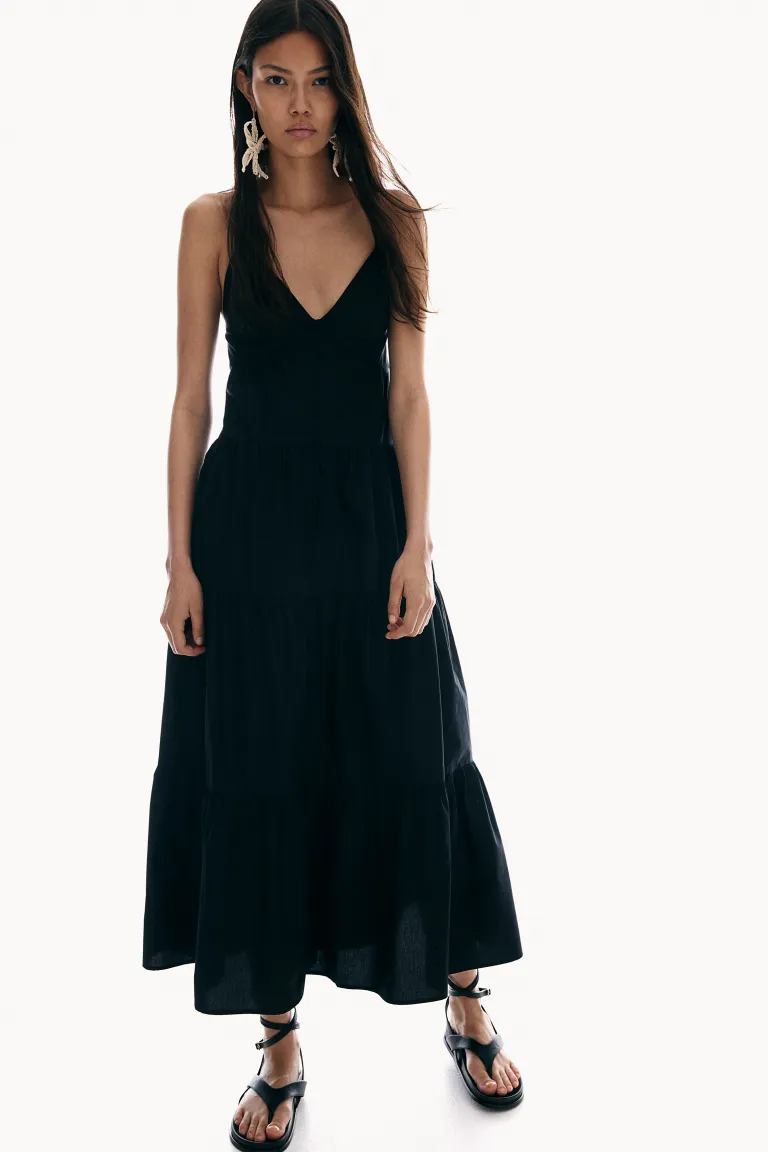 Новинка Длинное платье из плотного поплина с V-образным вырезом и узкими бретелями, которые протягиваются через небольшие петельки и завязываются сзади. Планка с обтянутыми пуговицами, узкая резинка сзади на талии и расклешенная ярусная юбка. На подкладке в области груди. Длина: Длинная Длина рукава: Без рукавов Посадка: Обычная посадка Фильм: Расклешенная спина, низкая спинка, платье на узких бретелях Вырез: V-образный