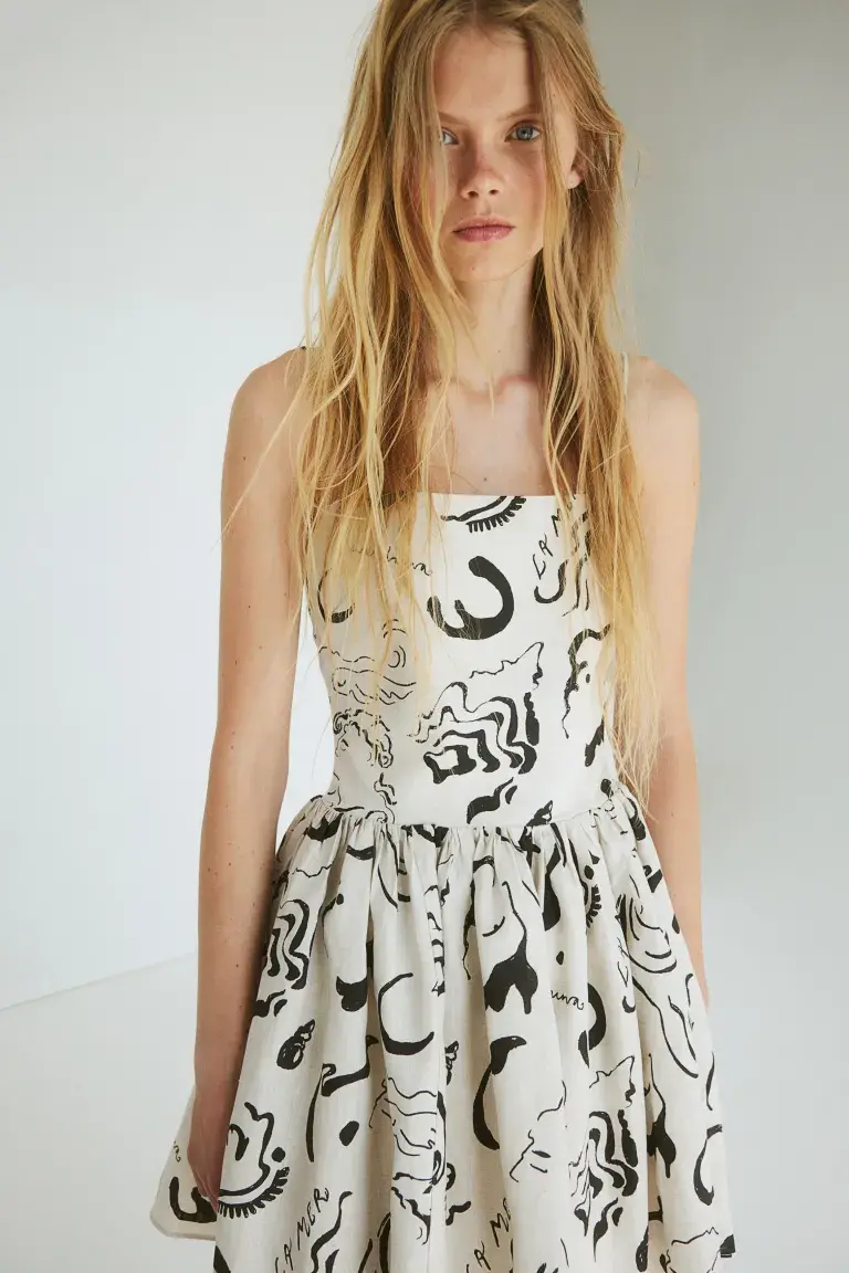 Короткое платье из узорчатого льна с прямым вырезом, бретельками-спагетти и облегающим лифом на молнии сзади. Разделительный шов со сборкой и расклешенная объемная юбка. Подкладка из хлопка.