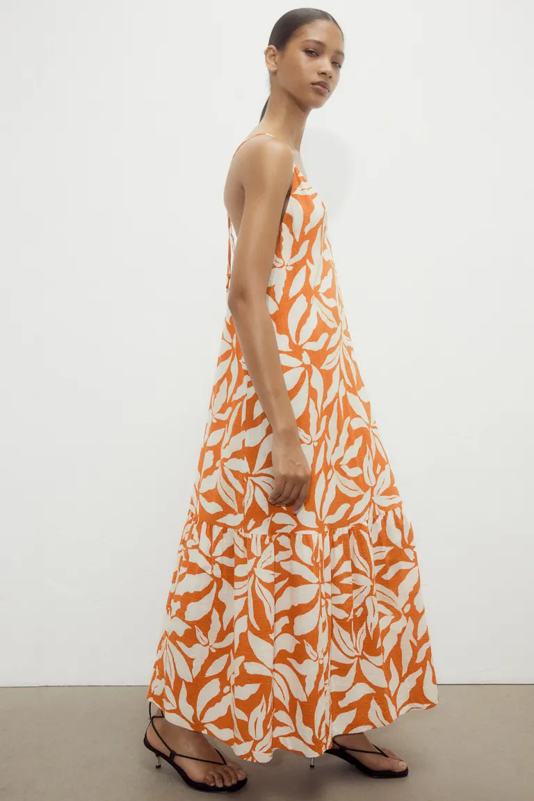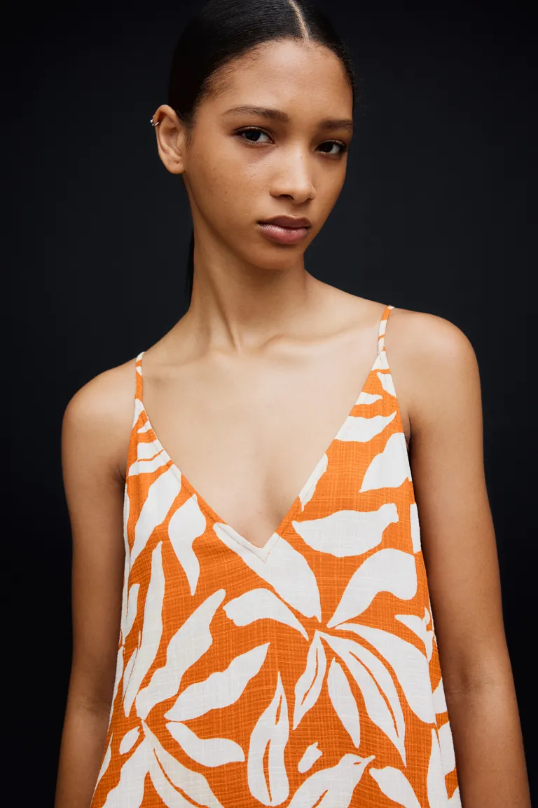 Длинное платье А-силуэта из тканого материала с V-образным вырезом и регулируемыми бретелями, соединенными сзади узкими бретелями. Глубокий круглый вырез сзади на резинке и присборенная юбка для дополнительного объема. Без подкладки. Длина: Длинная Длина рукава: Без рукавов Посадка: Обычная посадка Фильм: А-силуэт, низкая спинка, платье на узких бретелях Вырез: V-образный