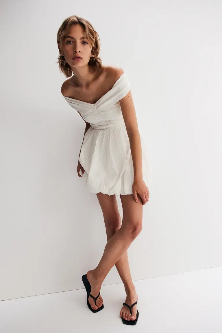Короткое платье с открытыми плечами из жатого хлопка с манжетами сверху и эластичными сборками по бокам. Облегающий фигуру топ с обтянутой резинкой спереди, присборенными боковыми швами и потайной молнией сзади. Разделительный шов со сборкой и расклешенная юбка. Размер: Спинка: Длина: 60,5 см (размер 38) Длина: Короткая Длина рукава: Короткий рукав Посадка: Обычная посадка Стиль: Babydoll, расклешенный, с открытыми плечами, присборенный