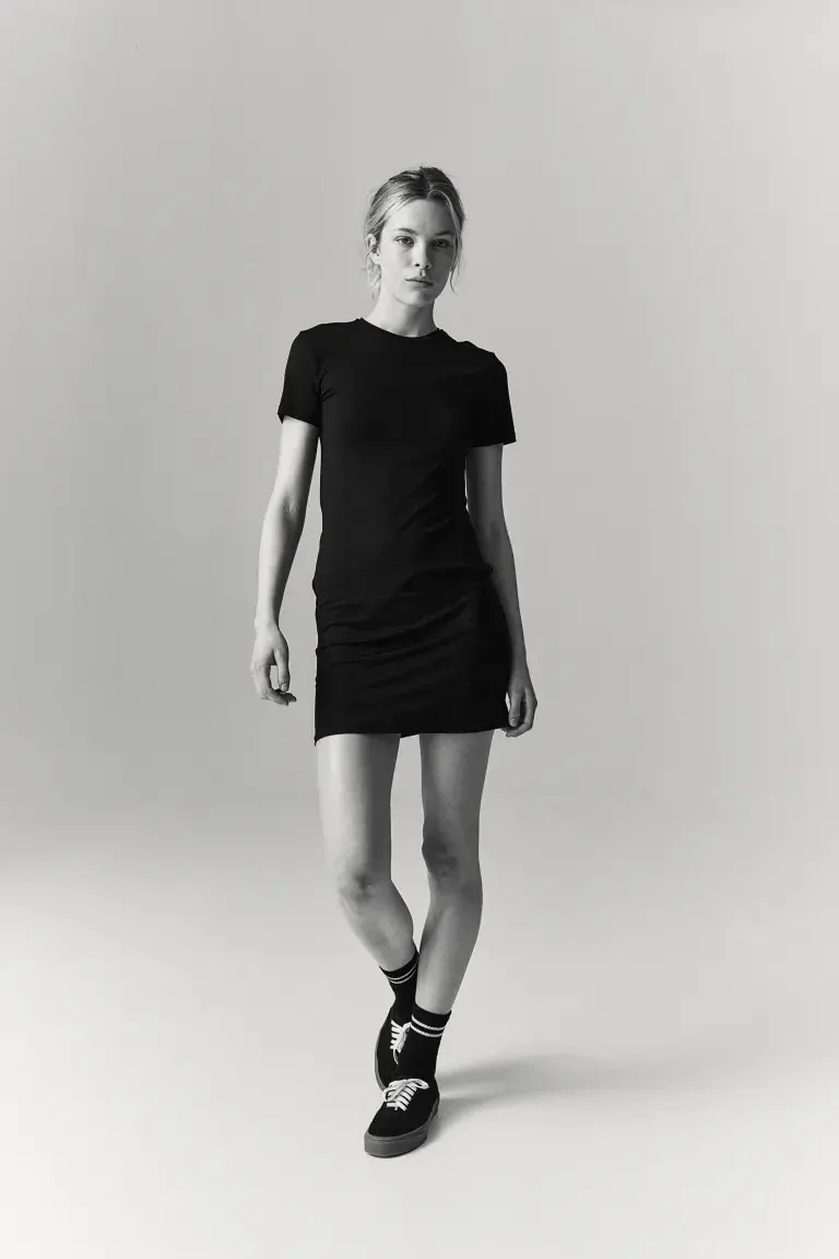 Короткое, облегающее фигуру платье-футболка из мягкой микрофибры с круглым вырезом.