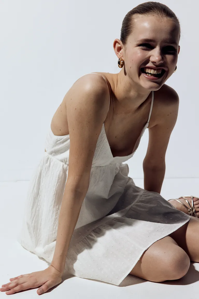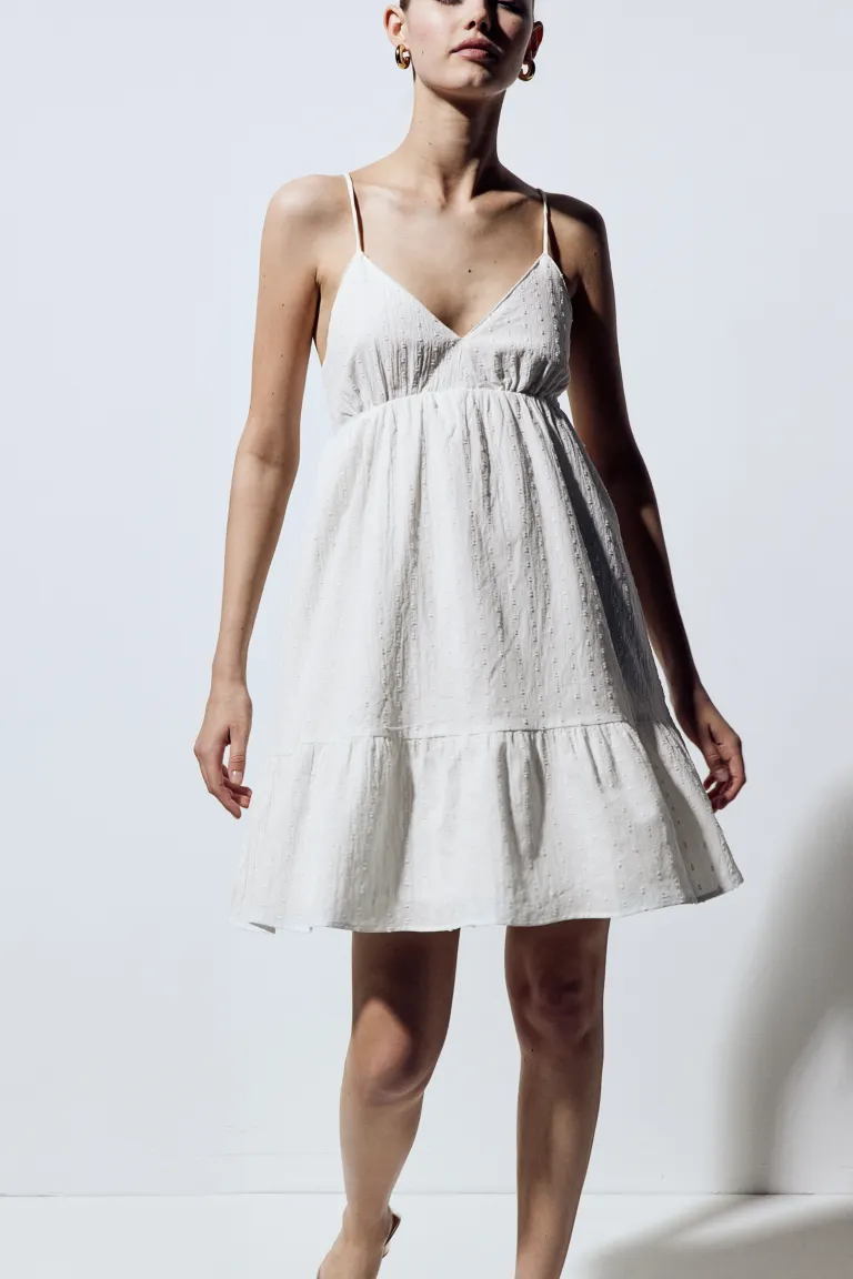 Короткое платье из хлопкового крепового переплетения с V-образным вырезом, частично открытой спиной и бретельками-спагетти, проходящими по бокам и завязывающимися сзади. Прилегает к груди, присборенный шов под грудью, узкая резинка сзади на талии и слегка расклешенная юбка. Присборенный шов по краю для дополнительной ширины и объема. На подкладке. Длина: Короткая Длина рукава: Без рукавов Посадка: Приталенный Фильм: Babydoll, Расклешенный, Открытая спина, Платье с узкими бретелями Вырез: V-образный