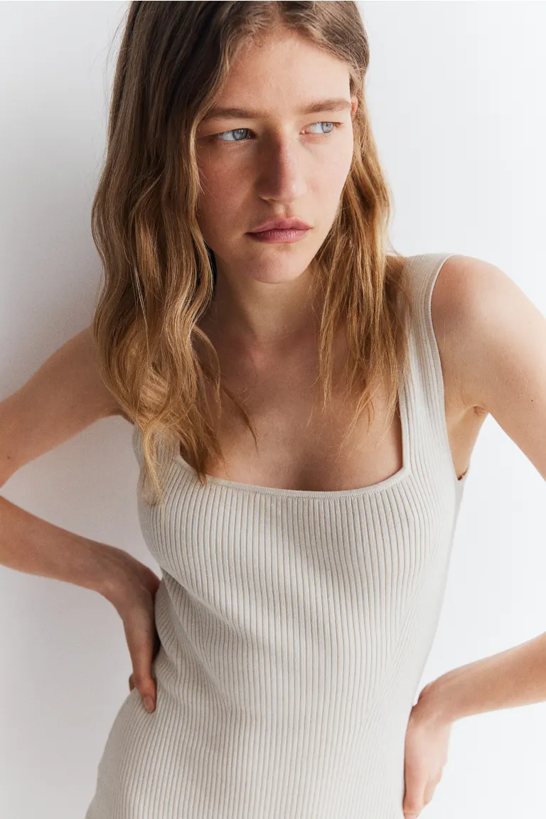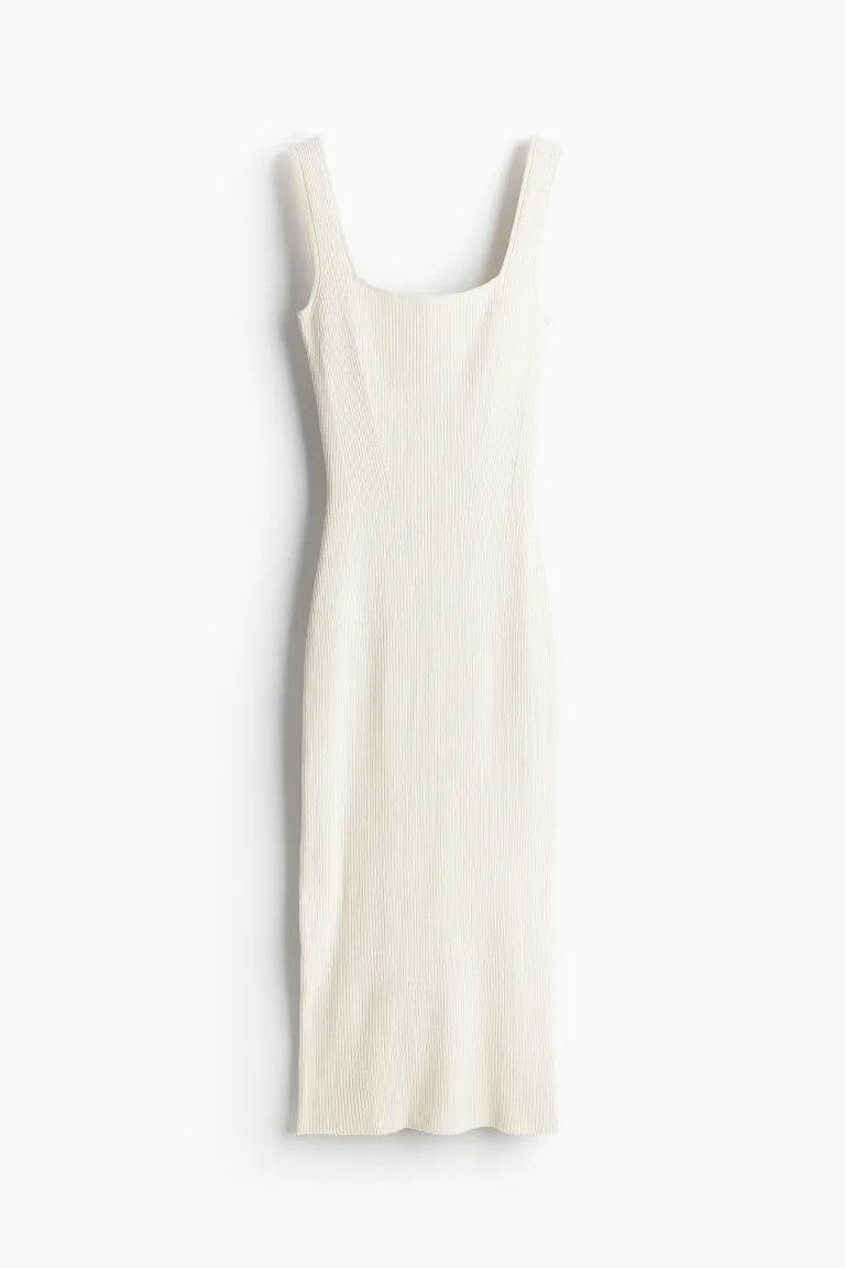 Облегающее фигуру платье длиной до икры из рубчатого трикотажа с широкими бретелями и квадратным вырезом с обеих сторон.