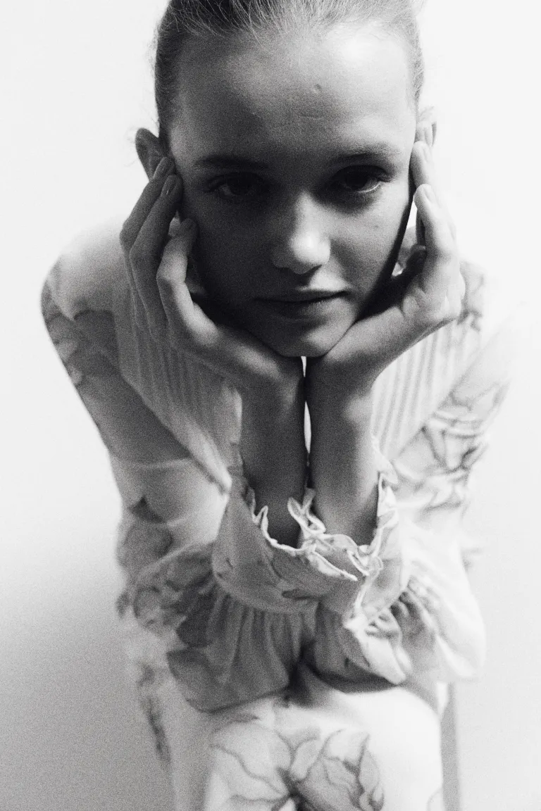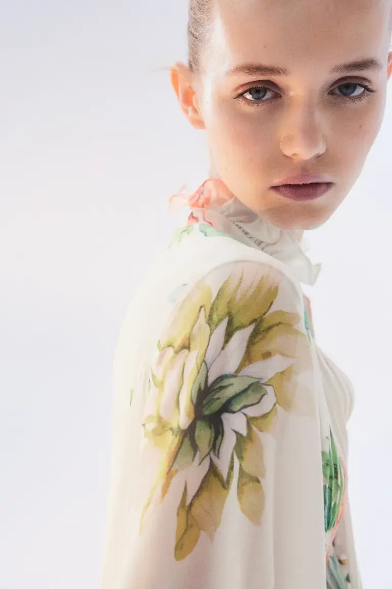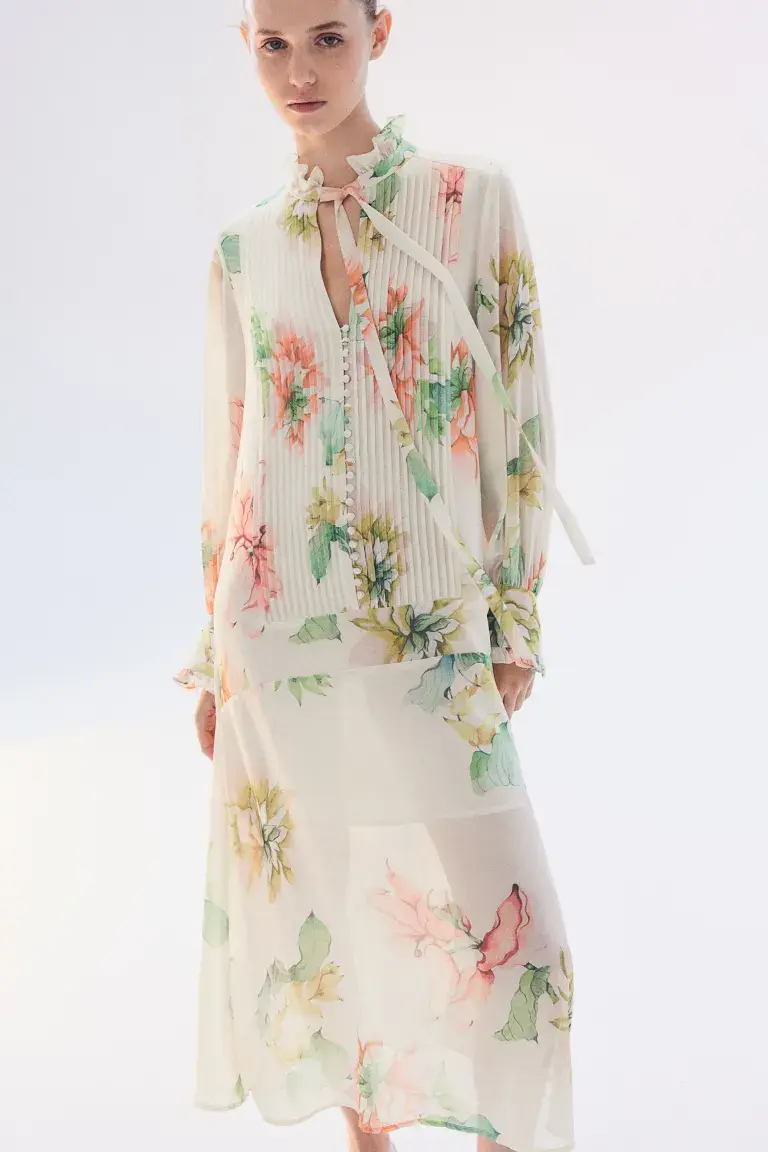 Платье свободного кроя длиной до икры из воздушного шифона с воланным воротником и вырезом на завязках спереди. Передняя часть со складками и обтянутыми пуговицами, двухслойная кокетка сзади. Длинные объемные рукава и широкие манжеты с воланом и обтянутой пуговицей. Частичная подкладка. Размер: Рукав: Длина: 62,5 см (размер M), Плечо: Ширина: 39,0 см (размер M), Спинка: Длина: 128,5 см (размер M) Длина: Миди Длина рукава: длинный рукав Посадка: свободная Воротник: бантик