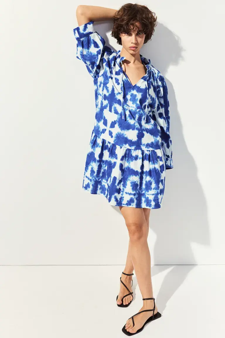 Новинка Короткое платье свободного кроя из хлопка с узким воротником с воланами и V-образным вырезом на узкой кулиске. Длинные рукава-фонарики с широкими манжетами и широкой оборкой внизу для дополнительной ширины. Без подкладки. Размер: Спинка: Длина: 88,0 см (размер M), Рукав: Длина: 54,5 см (размер M), Плечо: Ширина: 39,5 см (размер M) Длина: Короткая Длина рукава: длинный рукав Посадка: свободная посадка Воротник: волан Фильм: каплевидный вырез Вырез: V-образный Фон рукава: воздушный шар