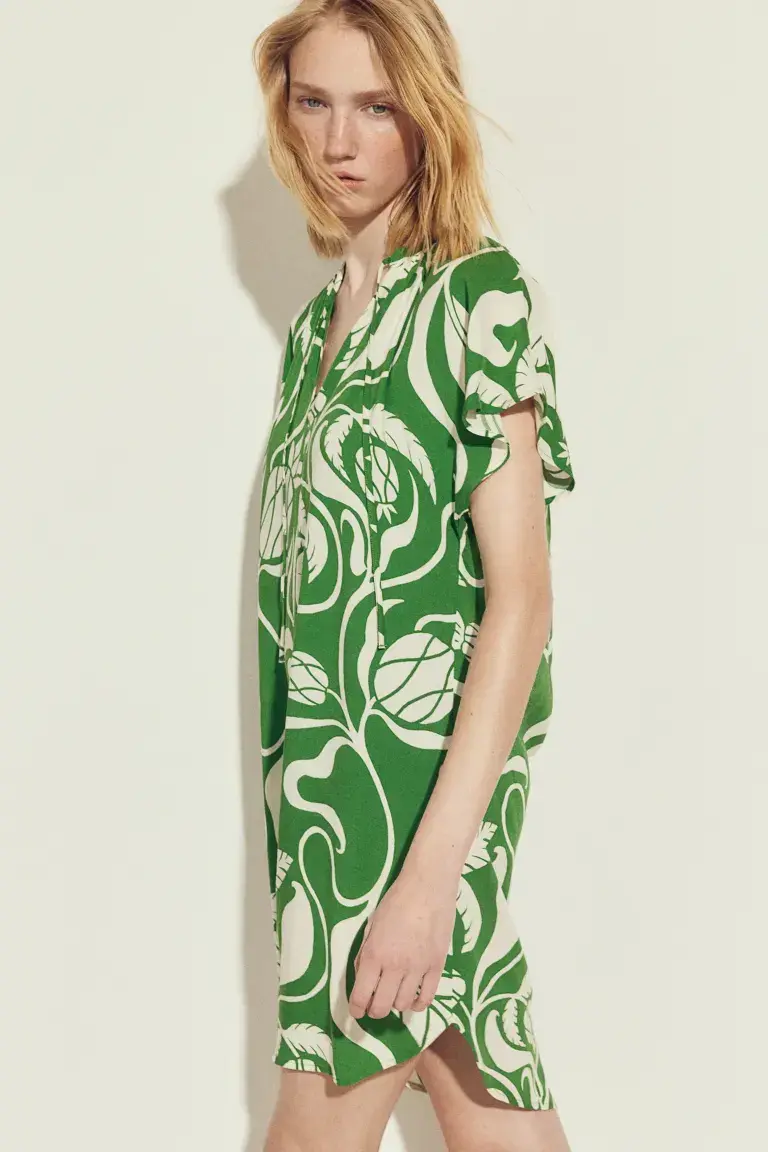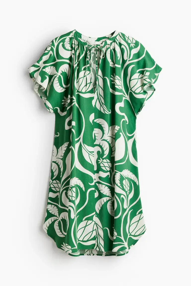 Короткое платье из вискозной ткани с круглым вырезом со сборками и вырезом на узких завязках спереди. Свободный крой с короткими рукавами-бабочками и закругленным краем. Без подкладки. Размер: Спинка: Длина: 92,0 см (размер M) Длина: Короткая Длина рукава: Короткий рукав Посадка: Свободный крой Фильм: Капюшон, завязки. спереди Вырез: Круглый вырез Фон рукава: Рукав-бабочка