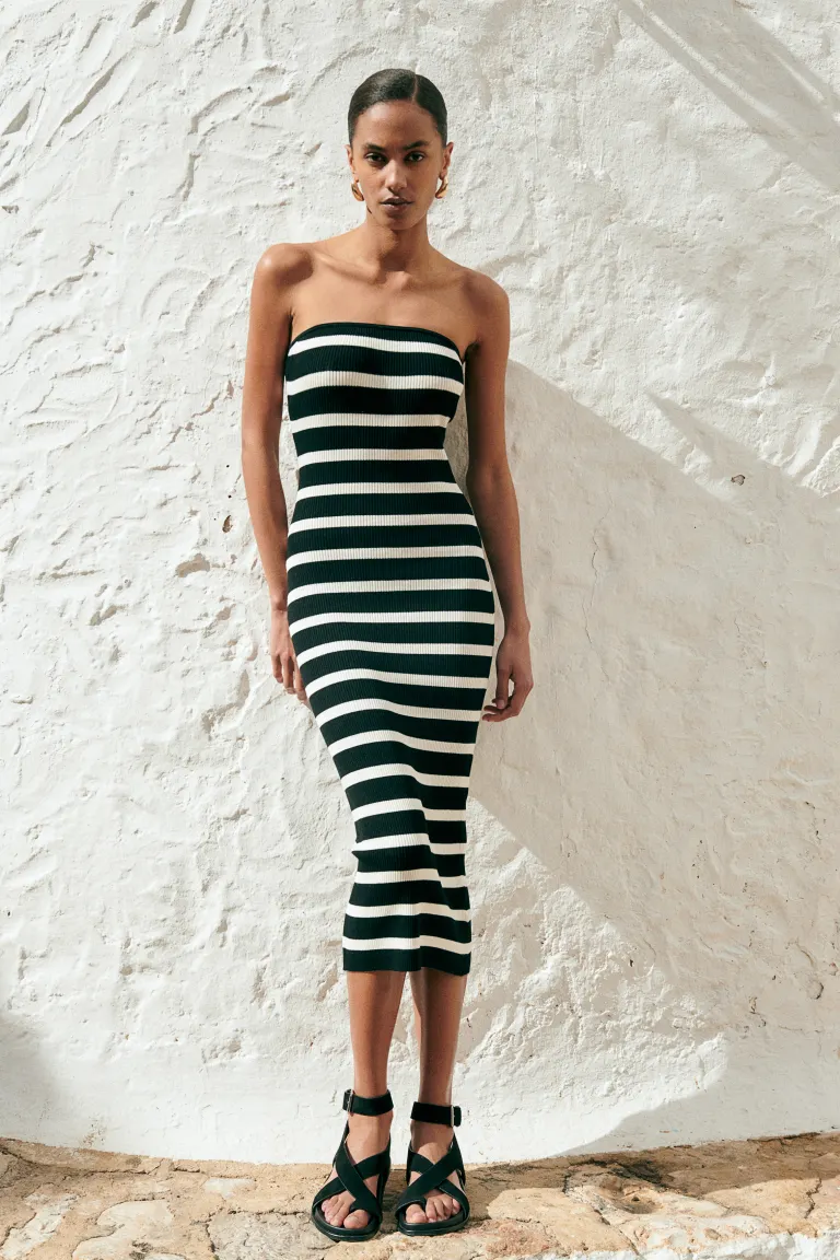 Облегающее фигуру платье длиной до икры из плотного трикотажа в рубчик со потайной силиконовой лентой сверху для надежной посадки.