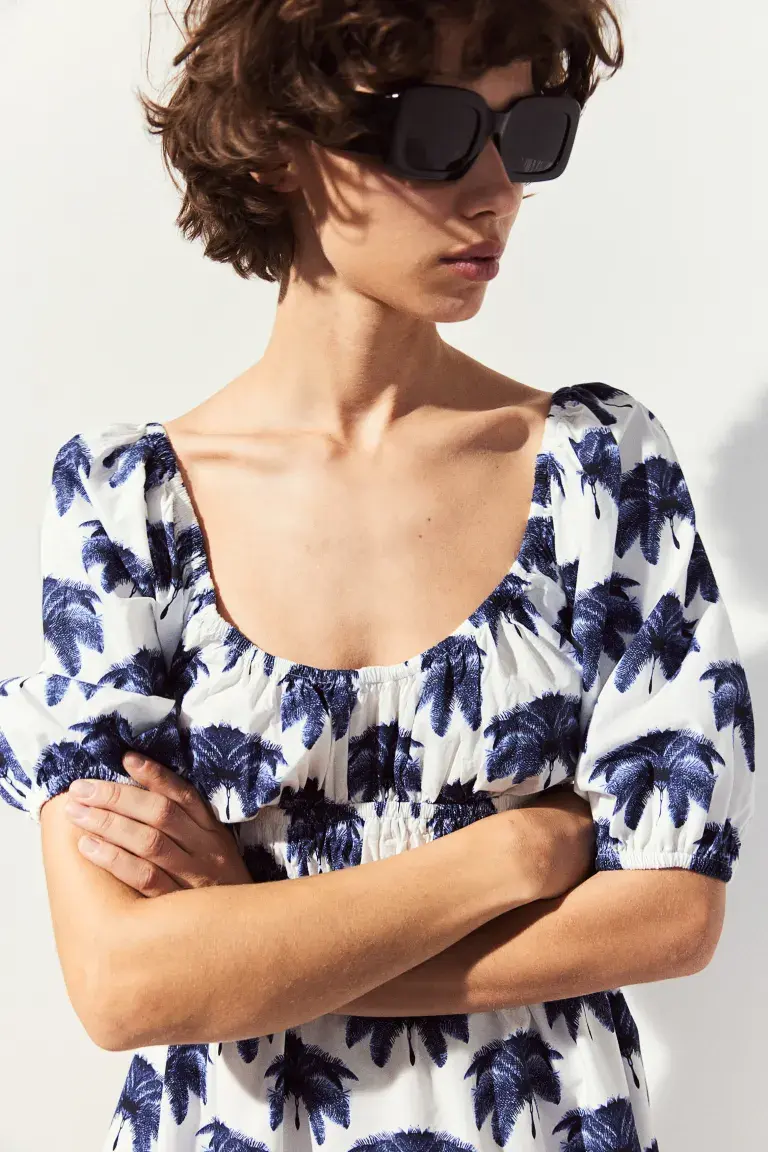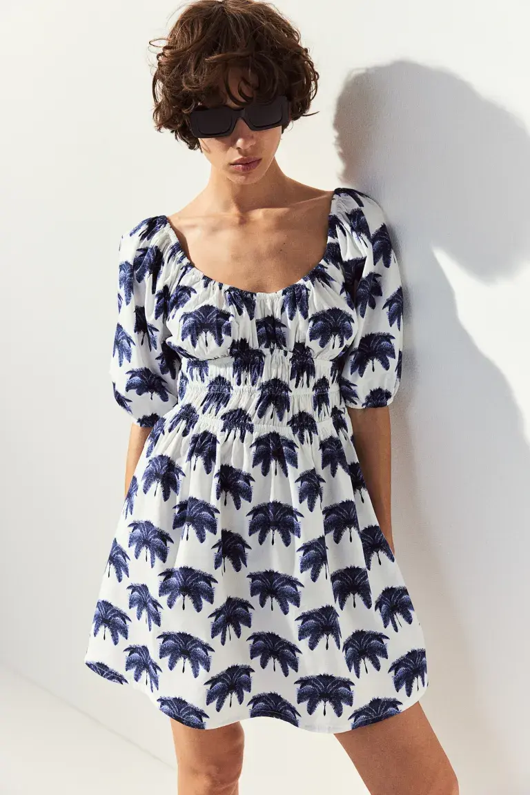 Новинка Короткое расклешенное платье из хлопка/вискозы с эластичным овальным вырезом, короткими рукавами-фонариками и присборенной талией. Без подкладки. Размер: Рукав: Длина: 38,5 см (размер M), Спинка: Длина: 67,5 см (размер M) Длина: Короткая Длина рукава: Короткий рукав Посадка: Приталенный крой Фильм: Глубокий вырез сзади, присборенный Вырез: Глубокий вырез Фильм рукава: Рукава-фонарики