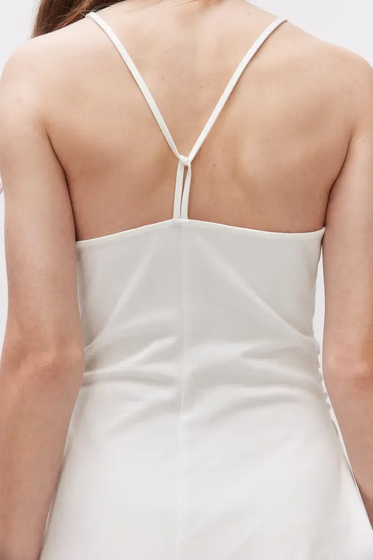 Короткое платье из мягкого хлопкового атласа с квадратным вырезом и узкими бретелями, сходящимися сзади. Потайная молния сбоку и оборки по бокам на талии для слегка драпированного эффекта. Приталенный лиф и слегка расклешенная юбка со сборкой для большей ширины. Без подкладки. Длина: Короткая Длина рукава: Без рукавов Посадка: Приталенный Стиль: Драпированный, Расклешенный, Платье с узкими бретелями Вырез: Квадратный вырез