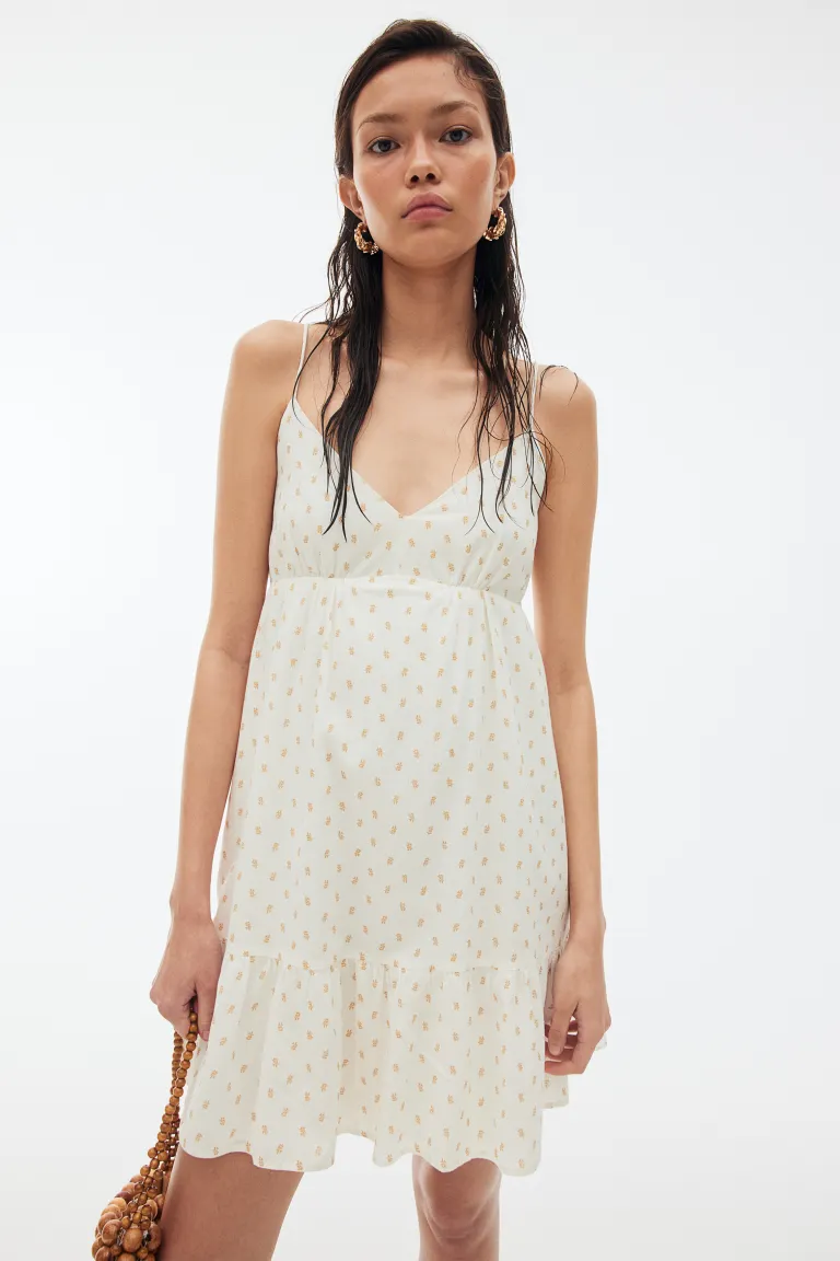 Короткое платье из хлопкового крепового переплетения с V-образным вырезом, частично открытой спиной и бретельками-спагетти, проходящими по бокам и завязывающимися сзади. Прилегает к груди, присборенный шов под грудью, узкая резинка сзади на талии и слегка расклешенная юбка. Присборенный шов по краю для дополнительной ширины и объема. На подкладке. Длина: Короткая Длина рукава: Без рукавов Посадка: Приталенный Фильм: Babydoll, Расклешенный, Открытая спина, Платье с узкими бретелями Вырез: V-образный