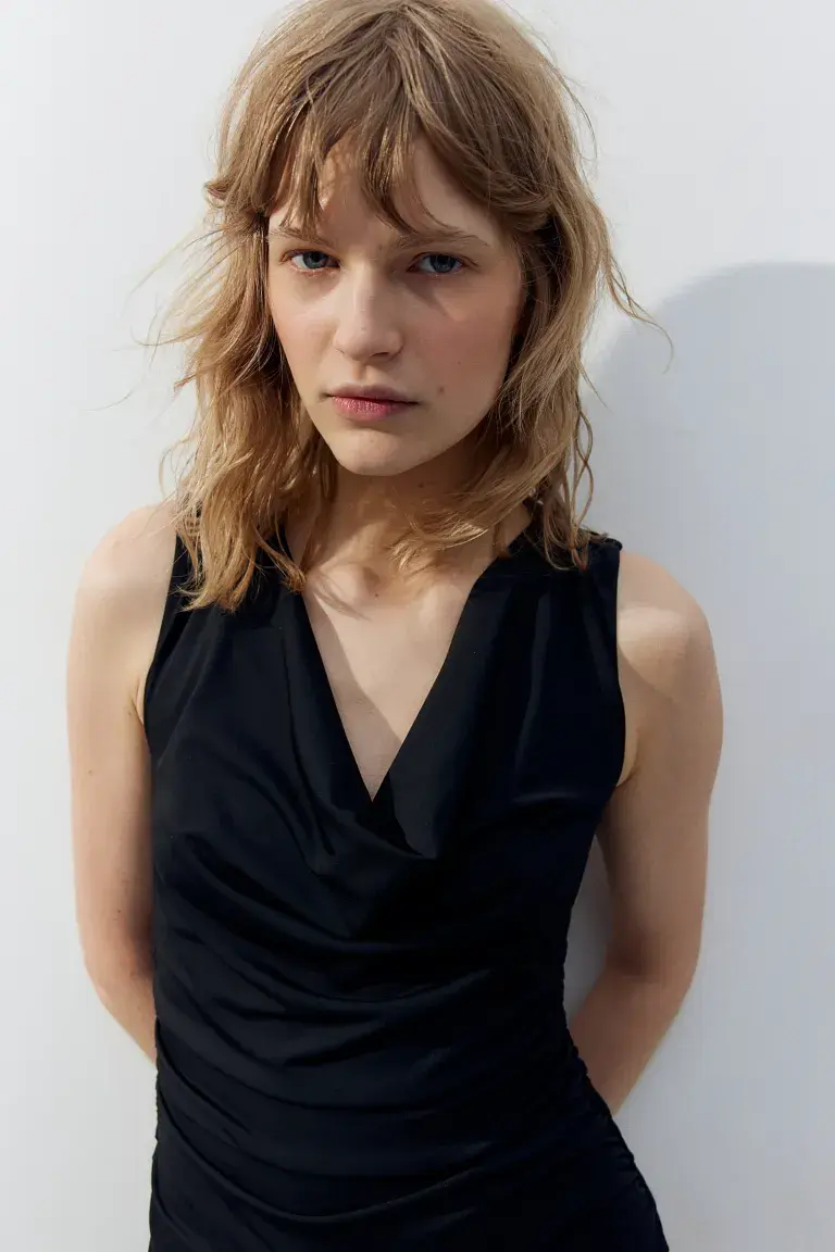 Платье без рукавов длиной до икры из крепового трикотажа. Модель облегает фигуру с вырезом-хомутом и оборками по бокам, образующими драпированный силуэт. На подкладке сверху.