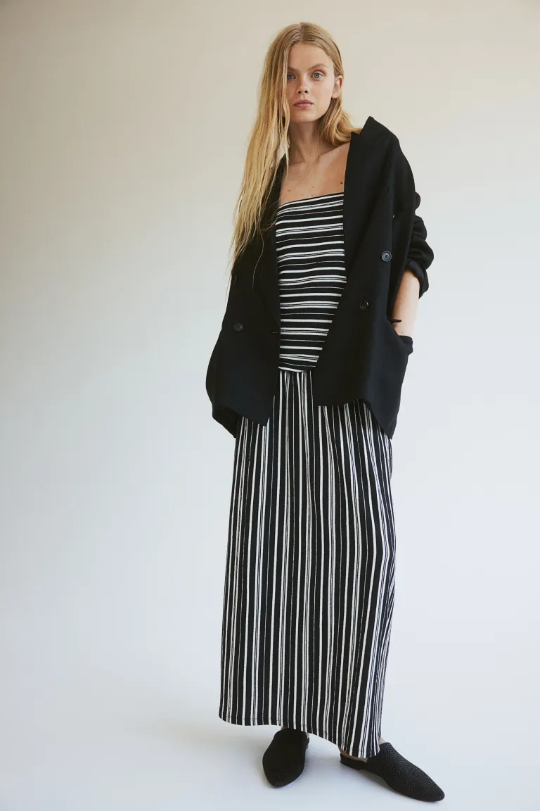 Платье-Бандо длиной до щиколотки из структурированного трикотажа с приталенным лифом, присборенным на бедрах и слегка расклешенной юбкой.